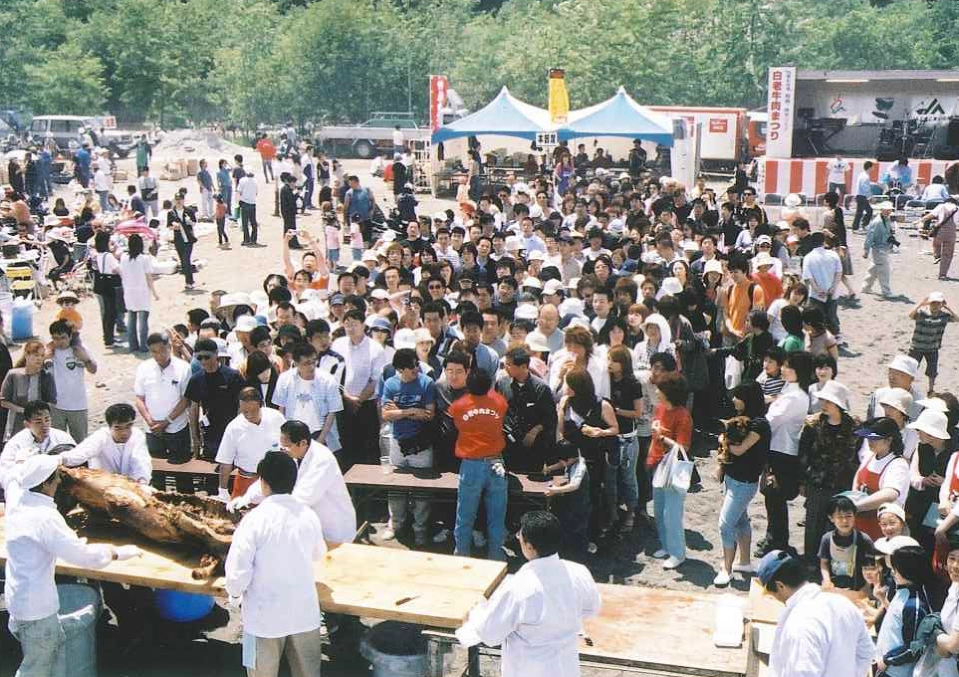 (青空の下で焼く白老牛は絶品です! 牛肉まつり名物の黒毛和牛の丸焼きは今年も実施します!)