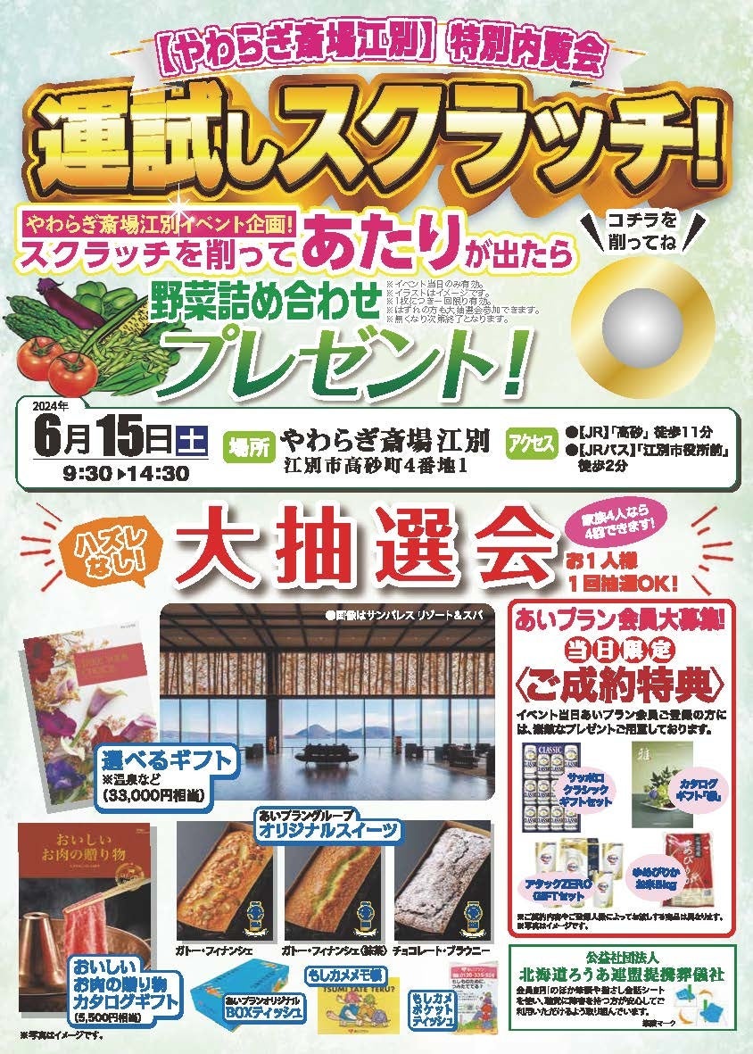 開催内容: 斎場見学、葬儀相談会、あいプラン互助会システムのご紹介、ハズレ無しの大抽選会、運試しスクラッチ、ほか