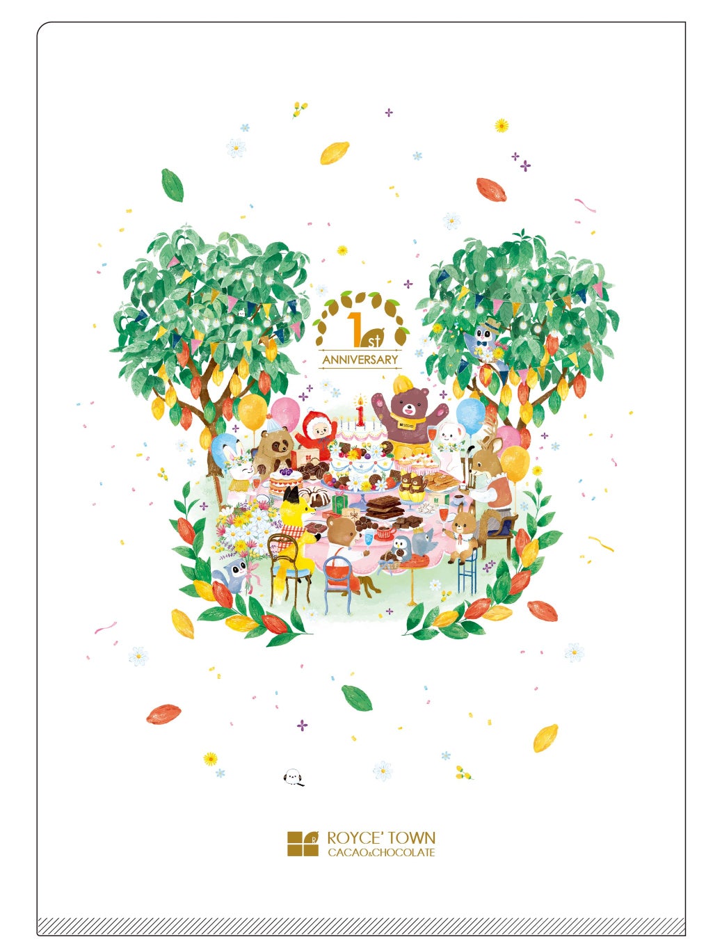 カカオクマと北海道に住まう動物たちが施設の1周年を楽しくお祝いしている様子を描きました。