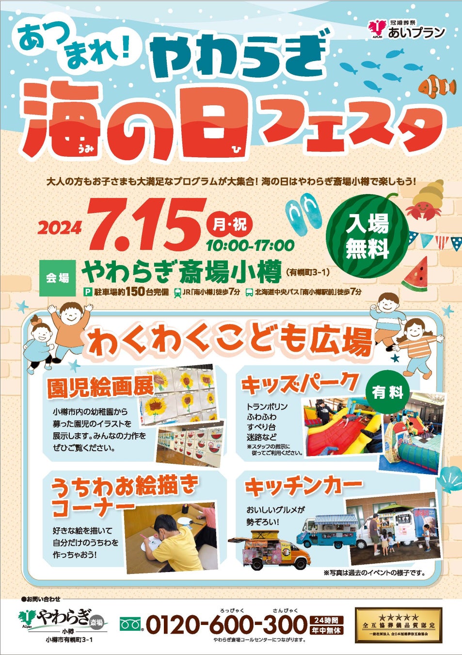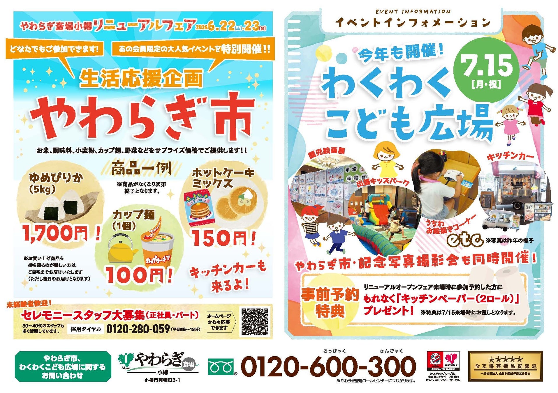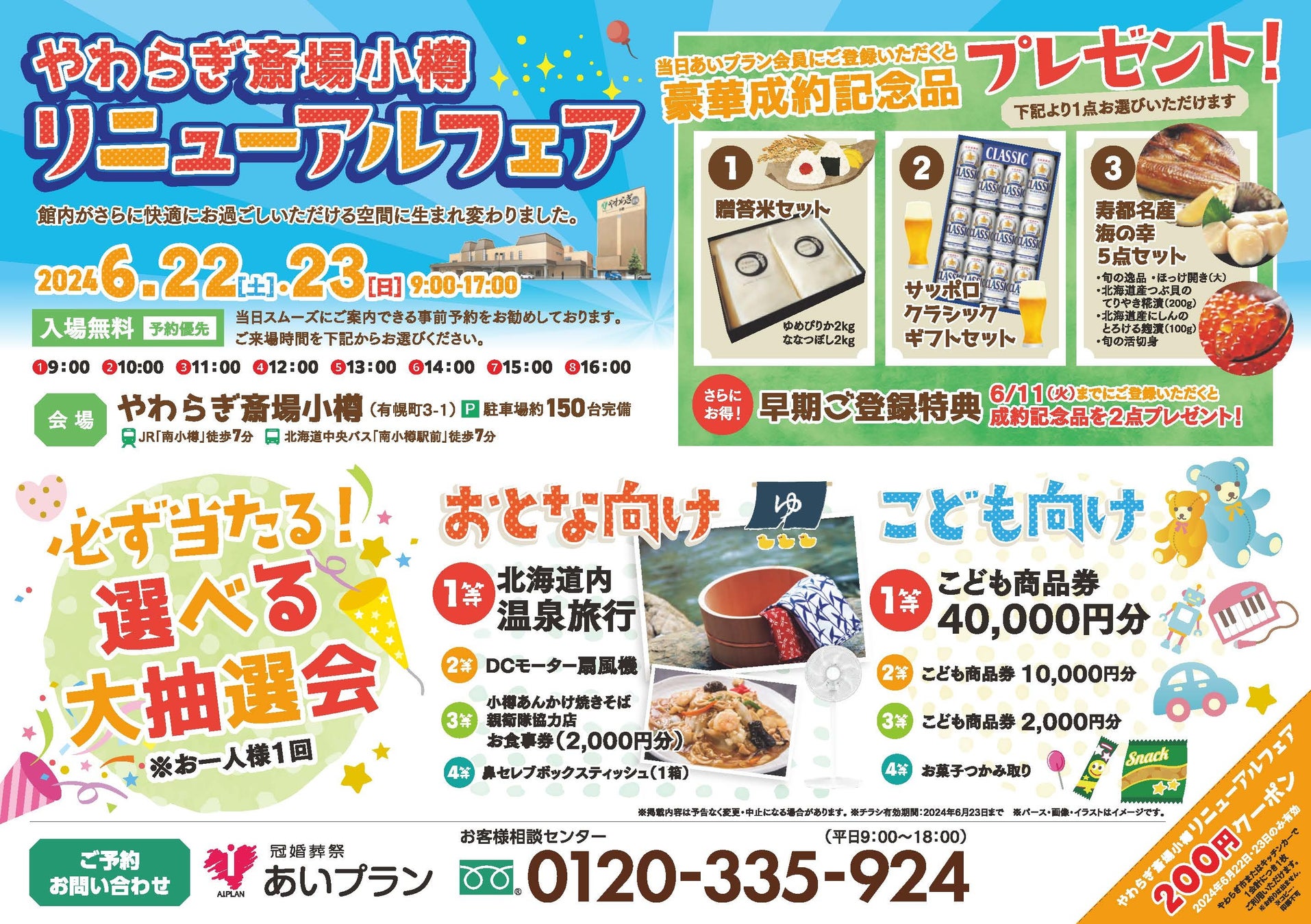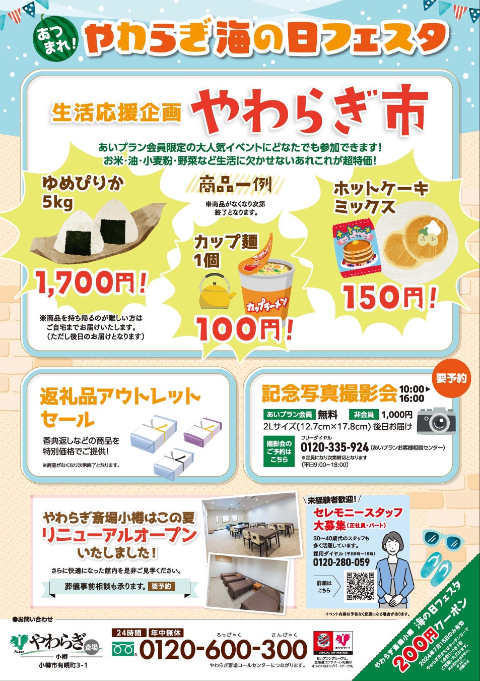 また、このリニューアルを記念して地域の皆様にご家族で楽しんでいただけるイベントを開催。新しくなった館内をご見学いただけるほか、大人も小さなお子様も楽しめる抽選会や毎日の生活に役立つやわらぎ市などを行いますので、ぜひご家族そろって新しくなったやわらぎ斎場 小樽へお越しくださいませ。