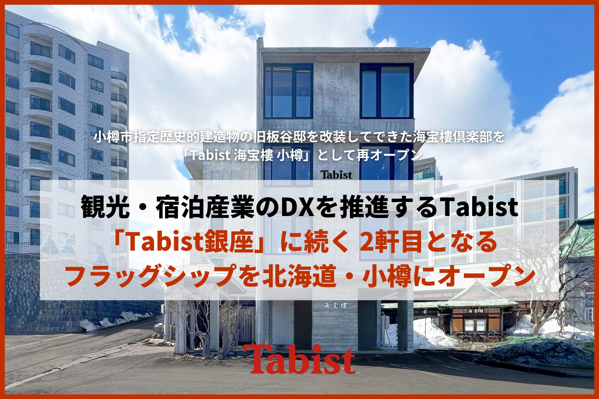 観光・宿泊産業のDXを推進するTabist株式会社(本社:東京都港区、代表取締役社長 兼CEO:田野崎亮太、以下:Tabist)は、フラッグシップである「Tabist 銀座」に続き、この度2軒目となるフラッグシップ「Tabist 海宝樓 小樽」を北海道小樽市にてオープンします。Tabistは、本フラッグシップオープンを通じ、北海道小樽エリアへの送客および地域活性化に向けた取り組みを推進していきます。