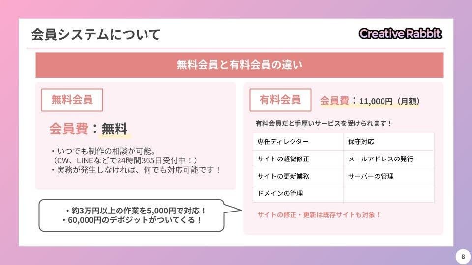 「クリエイティブラビット」はなんと会員費無料かつ無制限で制作に関する相談が可能。有料会員(月額11,000円)になると以下のサポートを追加で受けられるため、費用対効果を初月から実感いただけます。
