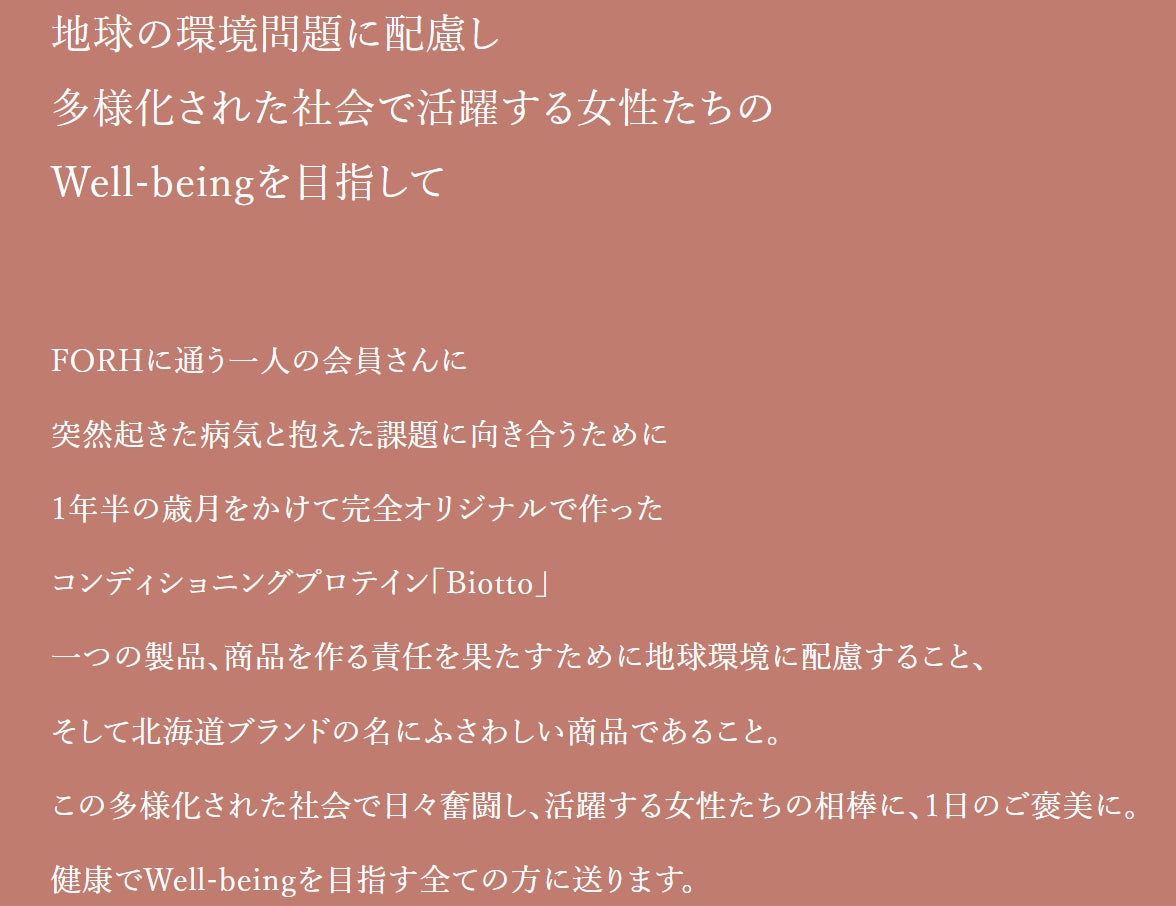 同社が運営する明るく開放的なコンディショニングジム「FORH」での経験を活かし、持続可能な健康と地球環境に配慮した製品づくりにも取り組んでいます。