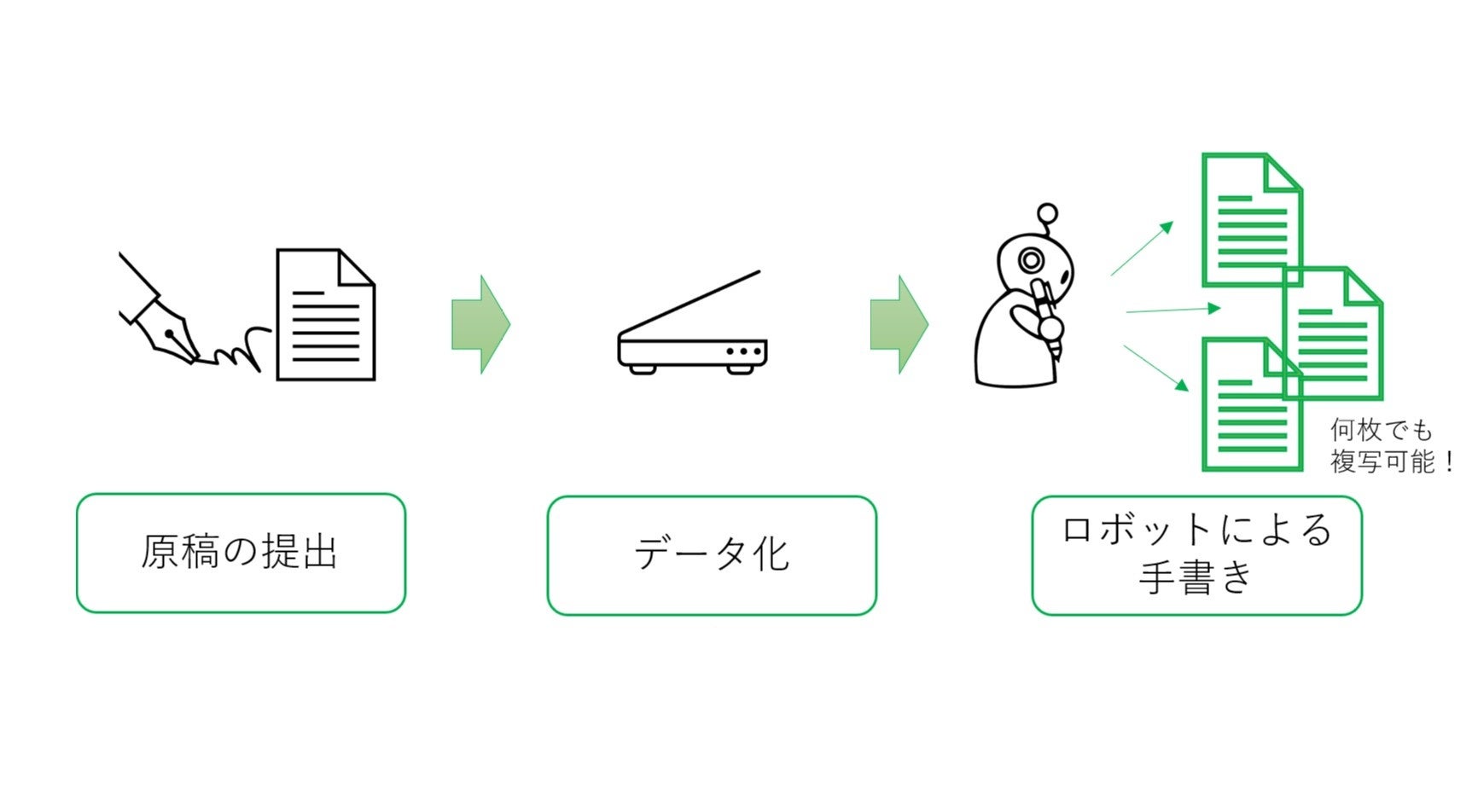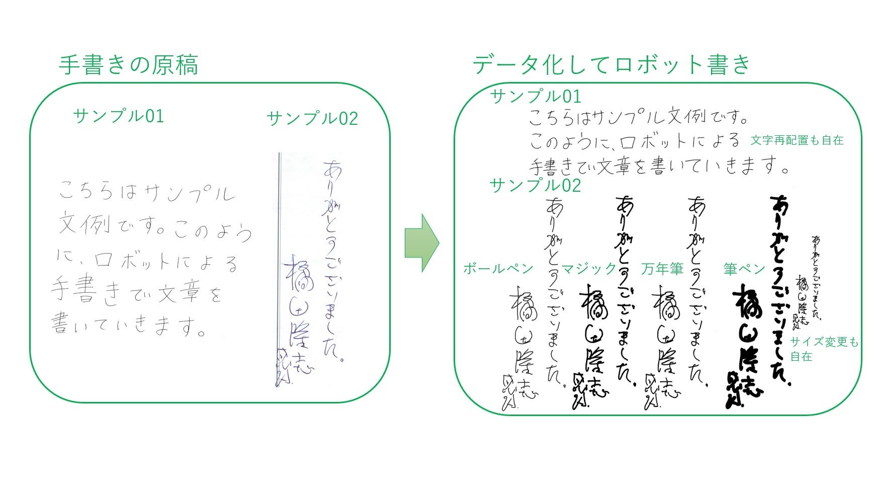 原稿の筆跡をデータ化し手書きの個性や特徴を保ちながらロボットが複写、文字の再配置やサイズの変更も自由自在。