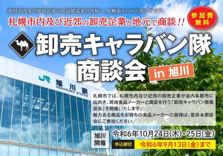 札幌近郊の卸売企業と道内食品メーカーの商談会である「卸売キャラバン隊商談会」について、旭川近郊の食品メーカーの参加募集をしています。募集期間は、9月13日(金)まで。