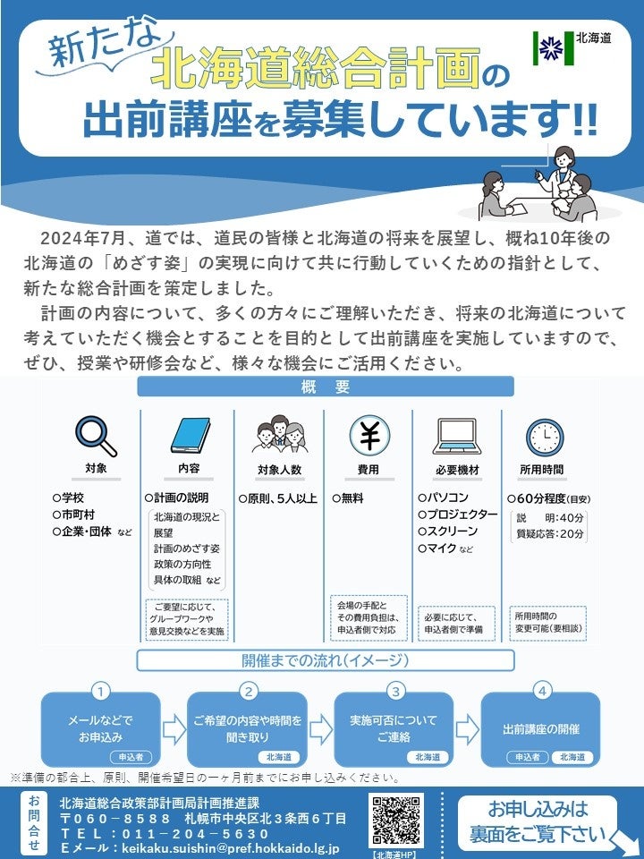 また、皆様にこの計画の内容をお知らせし、北海道の将来について考える機会としていただくため、出前講座を実施しています。