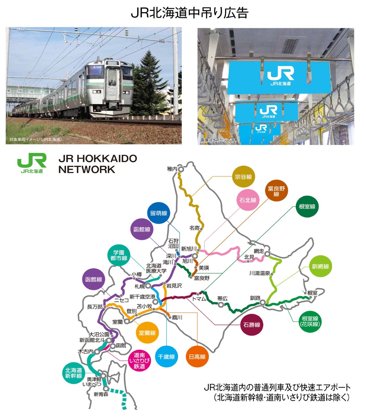 - 対象商品:「JR北海道中吊り広告」 × 「札幌市交通局中づりポスター」期 間:2024年10月8日(火) ~2024年12月24日(火) 掲出開始分を対象とします。掲載車両:道内の普通列車及び快速エアポート(列車運行区間に応じて6種類より選択)、札幌市営地下鉄全線の列車(南北線、東西線、東豊線)