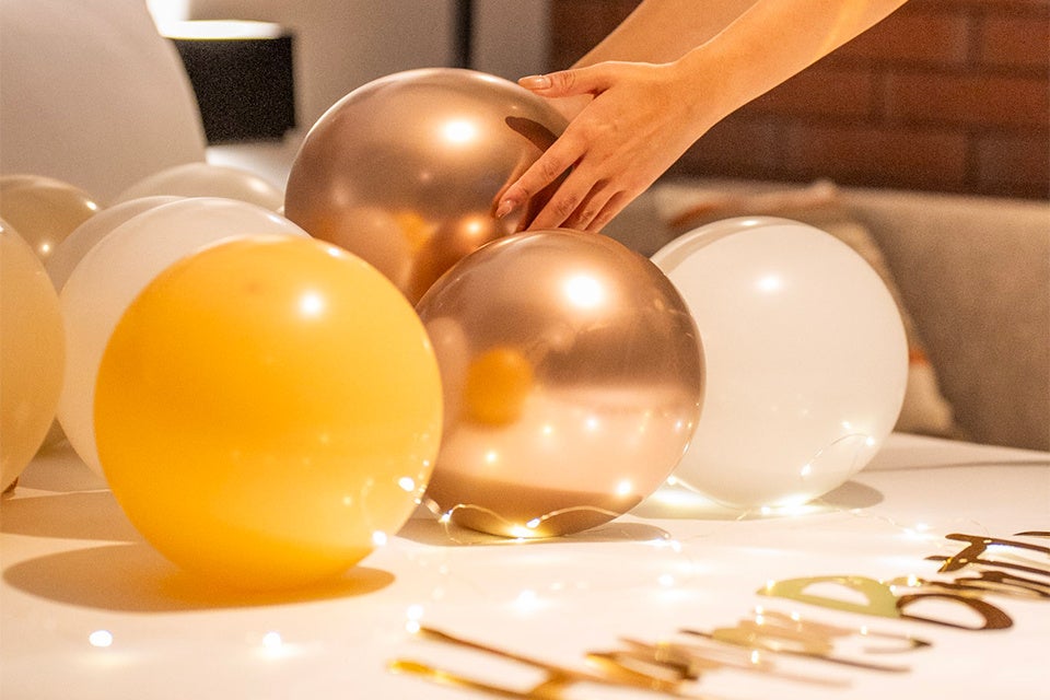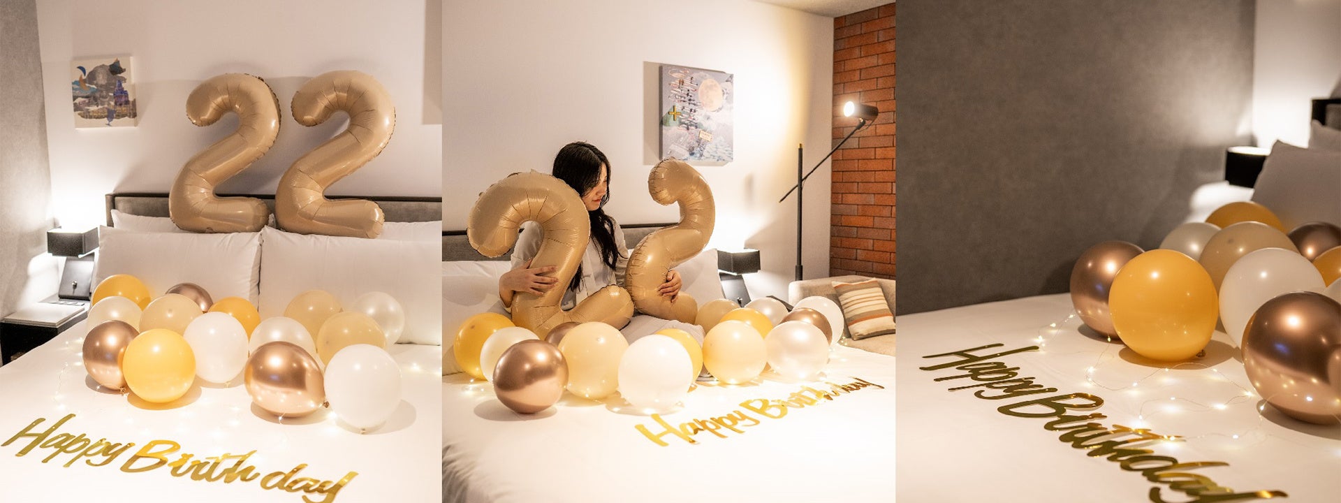 お部屋に⾜を踏み⼊れた瞬間、⽬に⾶び込んでくるのは、⼤きなナンバーバルーン。そして、華やかなバルーンがふんわりと飾られ、温かみのあるライトが優しくその場を包みます。ベッド上のアニバーサリーバナーは、特別な日を祝福するための一言。夢のような空間がお部屋全体に広がります。
