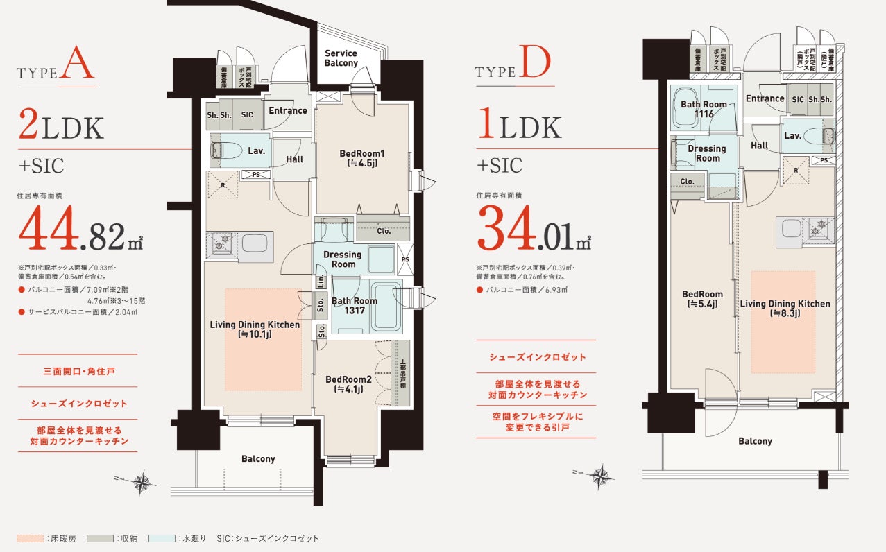 住居専有面積:31.42m²~44.82m²(※戸別宅配ボックス面積0.33m²~0.53m²・備蓄倉庫面積0.34m²~0.76m²を含む)