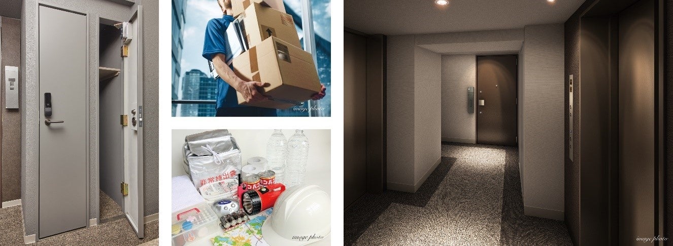 各住戸の玄関側に戸別宅配ボックス・備蓄倉庫を設置しました。ご不在時でも荷物を自宅玄関側の専用宅配ボックスまで運んで貰えるので受け取りがラクラク!また、地震など万が一の災害の際の備蓄用品や生活用品のストックを収納できる備蓄倉庫もあるので、居室空間を目一杯広く活用する事ができます。