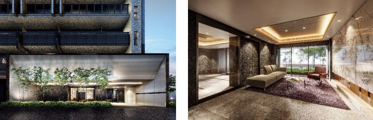 ※掲載のエントランスアプローチ・ラウンジ完成予想CGは 計画段階の図面を基に描き起こしたもので実際とは異なります。なお、外観の細部及び設備機器等は一部省略又は簡略化しております。家具・調度品等は今後変更になる場合があります。実物と質感・色等の見え方が異なる場合があります。植栽は計画段階のもので変更となる場合があります。