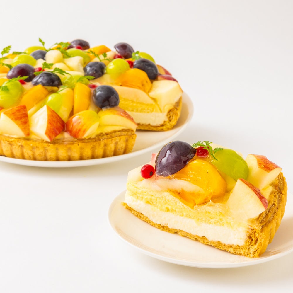 天然のはちみつを使用したムースに、秋に旬を迎える洋梨、ぶどう、柿、りんごを飾った、華やかなタルトです。