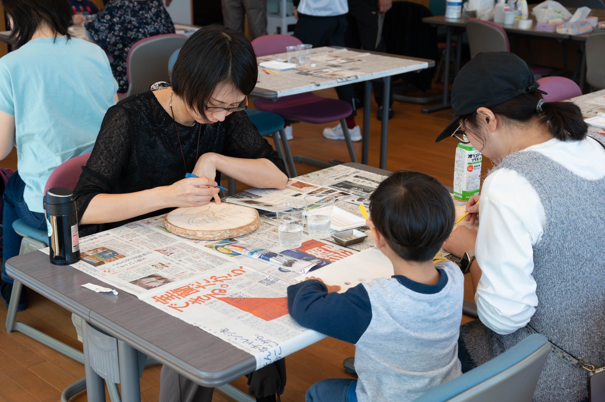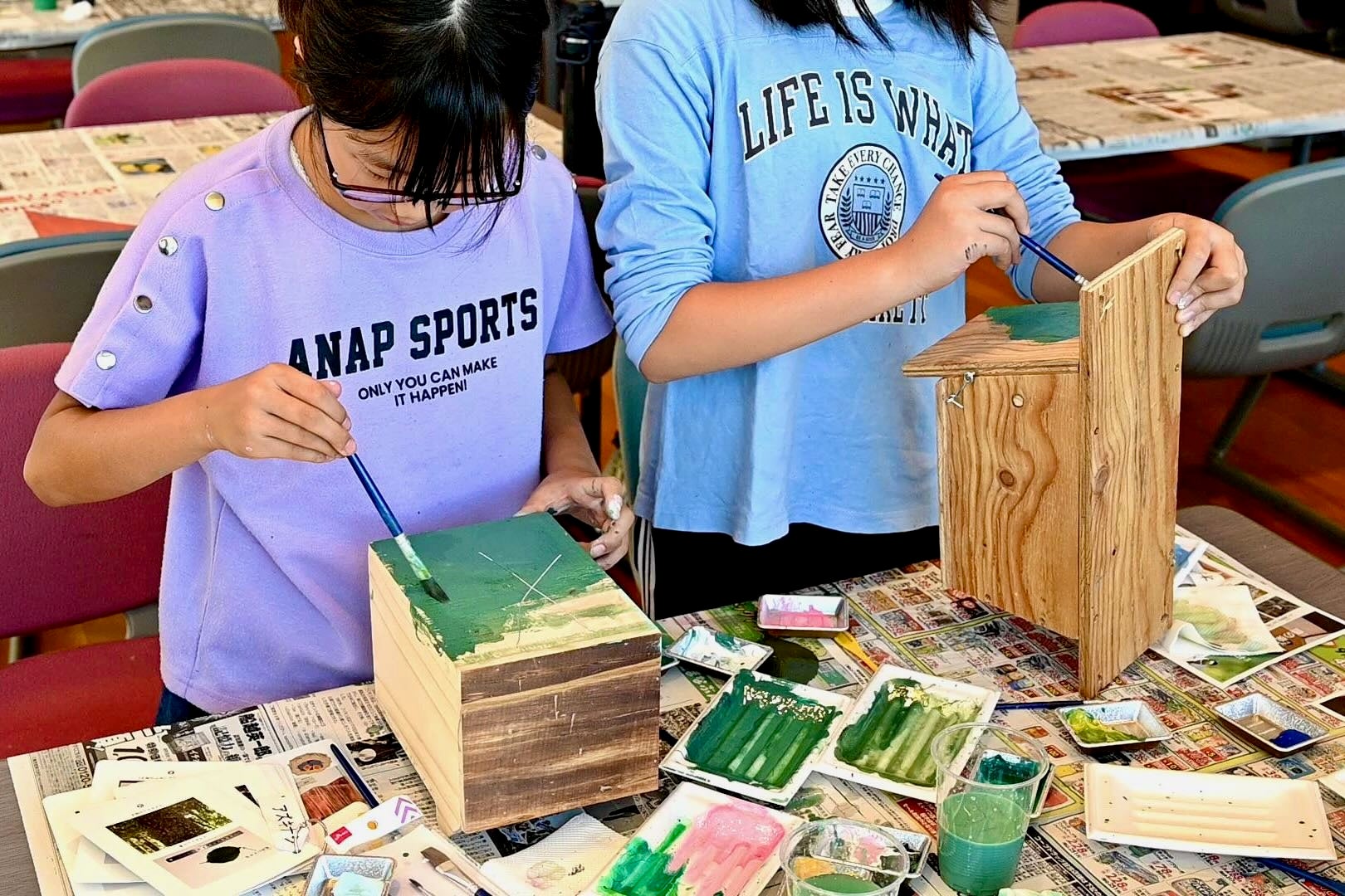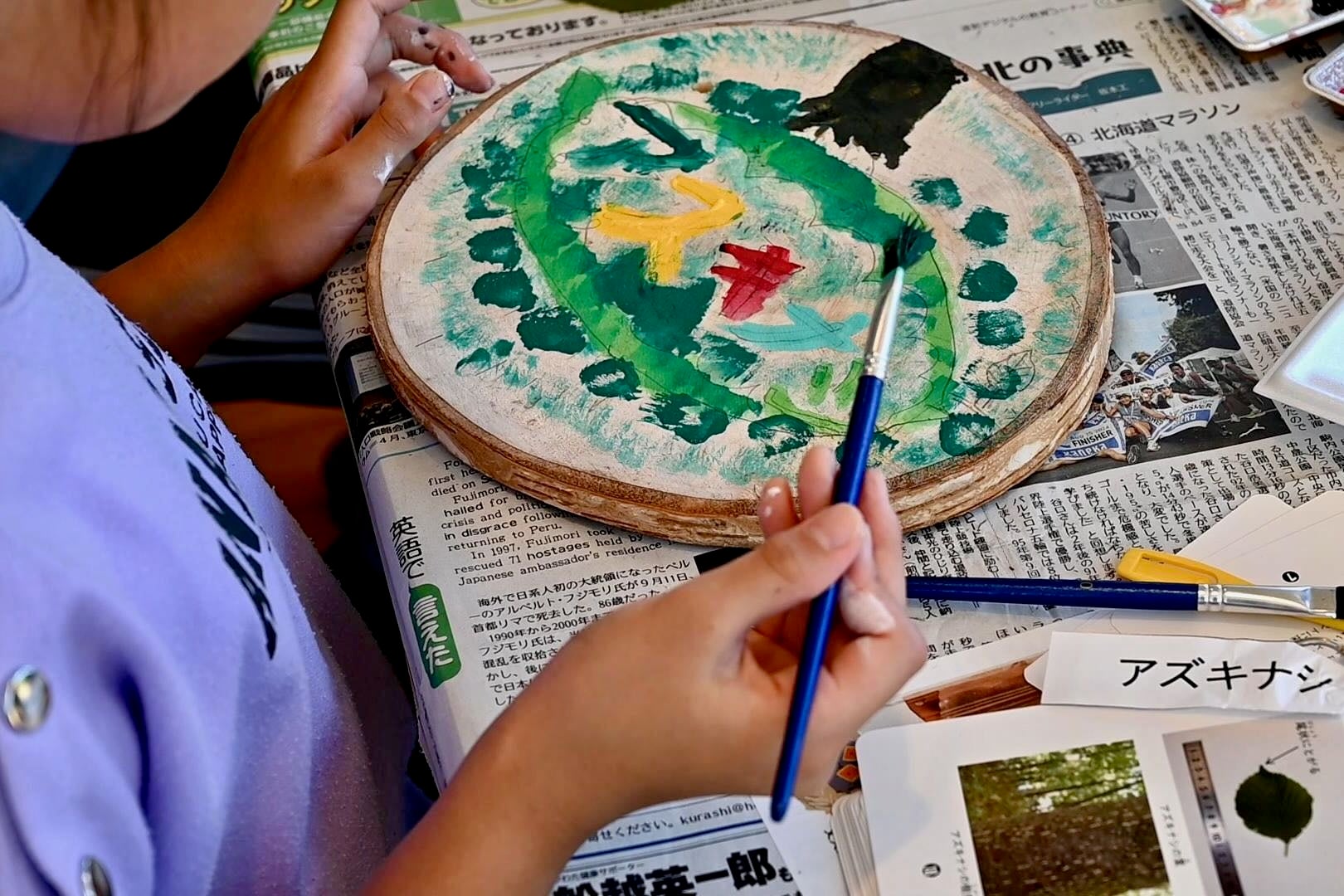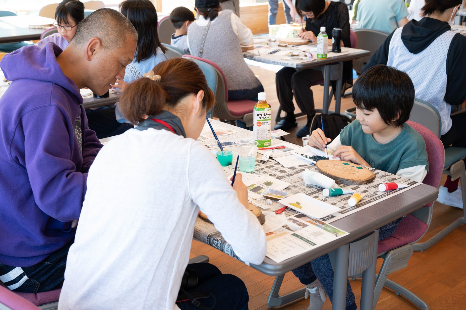 株式会社アミノアップに集合し、くじ引きで樹名板に書く樹木の名前を決めたあと、それぞれの樹木の解説や見つけ方等のレクチャーを受け、樹名板の製作に入りました。鉛筆で下書きをした後、アクリル絵の具を使って自由に色を付けていきます。普段から絵を描いているという女性は納得の仕上がりに。子供たちも思う存分好きなだけ絵の具を使って完成させました。そして、早く終わった子供たちは鳥の巣箱作りのお手伝いも。この巣箱は来年営巣ができるよう、株式会社アミノアップの敷地内に後日設置します。