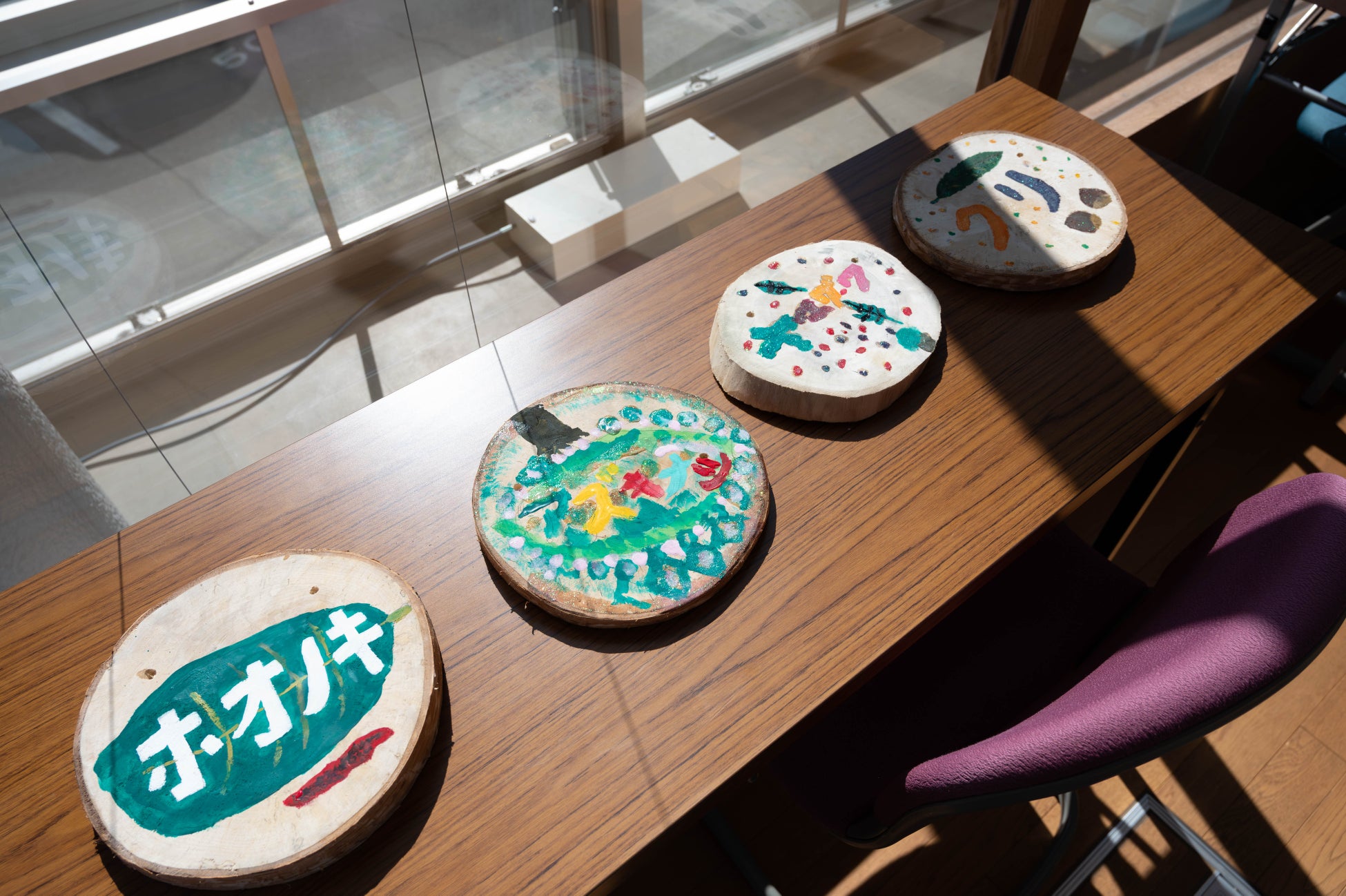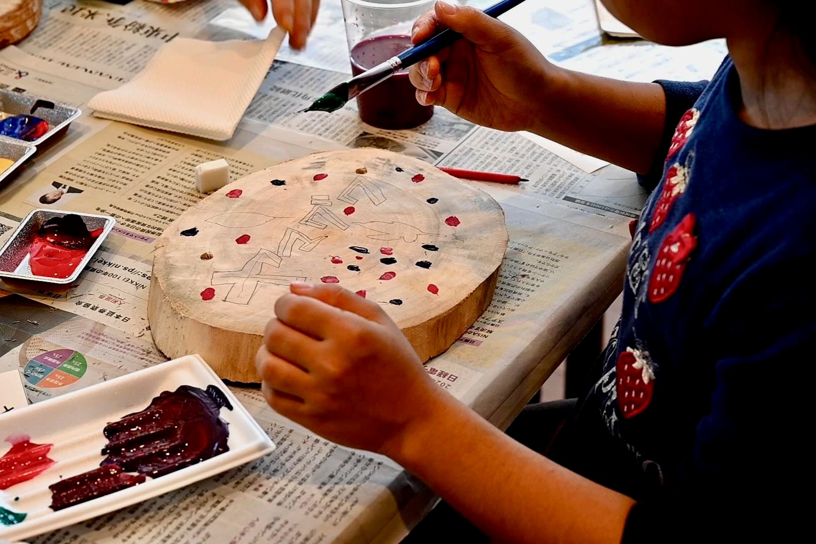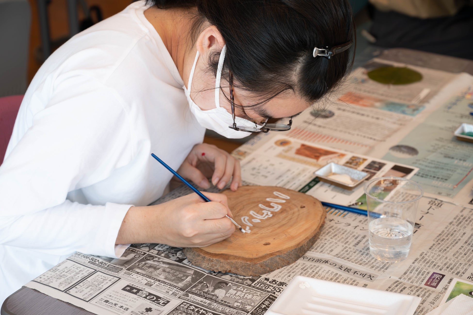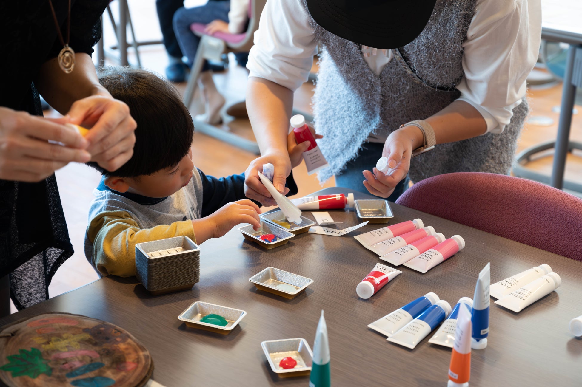 株式会社アミノアップに集合し、くじ引きで樹名板に書く樹木の名前を決めたあと、それぞれの樹木の解説や見つけ方等のレクチャーを受け、樹名板の製作に入りました。鉛筆で下書きをした後、アクリル絵の具を使って自由に色を付けていきます。普段から絵を描いているという女性は納得の仕上がりに。子供たちも思う存分好きなだけ絵の具を使って完成させました。そして、早く終わった子供たちは鳥の巣箱作りのお手伝いも。この巣箱は来年営巣ができるよう、株式会社アミノアップの敷地内に後日設置します。