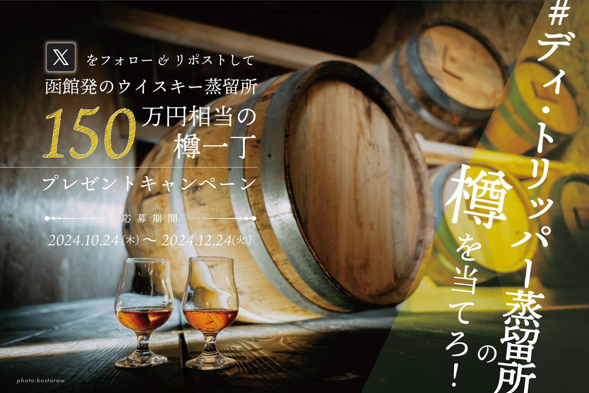 ビハインド・ザ・カスク合同会社(本社:北海道函館市、代表:澤田 凌)は、 昨年実施したクラウドファンディングで目標金額の1,062%を達成したことを記念し、抽選で1名様に「ディ・トリッパー蒸留所の樽(たる)一丁分のジャパニーズウイスキー」が当たる大規模なプレゼントキャンペーンを実施します。クラファンでのご支援の感謝の気持ちと来年1月ファーストリリースを控えるディ・トリッパー蒸留所の更なる認知度の向上を目指します。