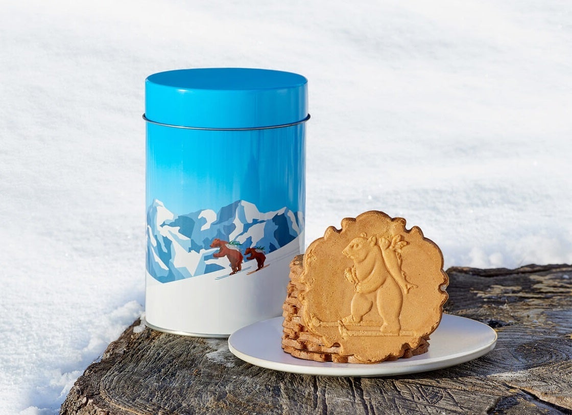 上質なバターとミルク、卵を使用した「風味豊かな洋風煎餅」で、パリッと食べ心地の良い食感が特徴の1930年(昭和5年)発売のロングセラー商品です。笹の葉と鮭を背負って、スキーにのった熊がレリーフになっています。2024年にリニューアルした新しいパッケージデザインは、北海道の澄んだ青空を背景に、笹の葉と鮭を背負った熊が、スキーに乗って雪山を滑り降りる姿を表現しています。