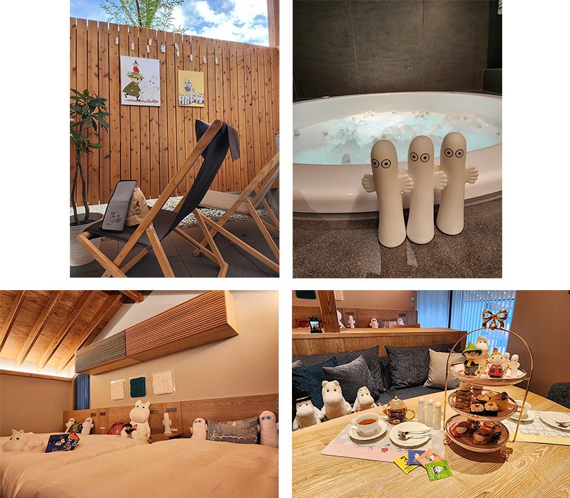 内容 | 1.ムーミンや仲間たちと「添い寝ベッド」 2.50匹のニョロニョロと入る「ラベンダー香るラグジュアリージェットバス」 3.ムーミンの仲間たちと「ととのうプライベートサウナ」 4.パティシエがつくる「ムーミン ウェルカム アフタヌーンティー」 |