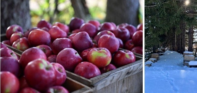 右)収穫・選別した旭は木箱に入れ、高樹に覆われた自然の貯蔵場に並べて追熟。追熟するにつれ、酸味は落ち着き香りが強くなる。