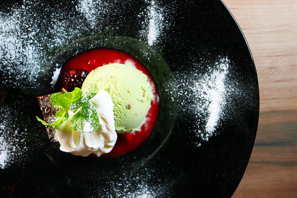 【メニュー名】ガトーショコラとピスタチオジェラート ベリーソース