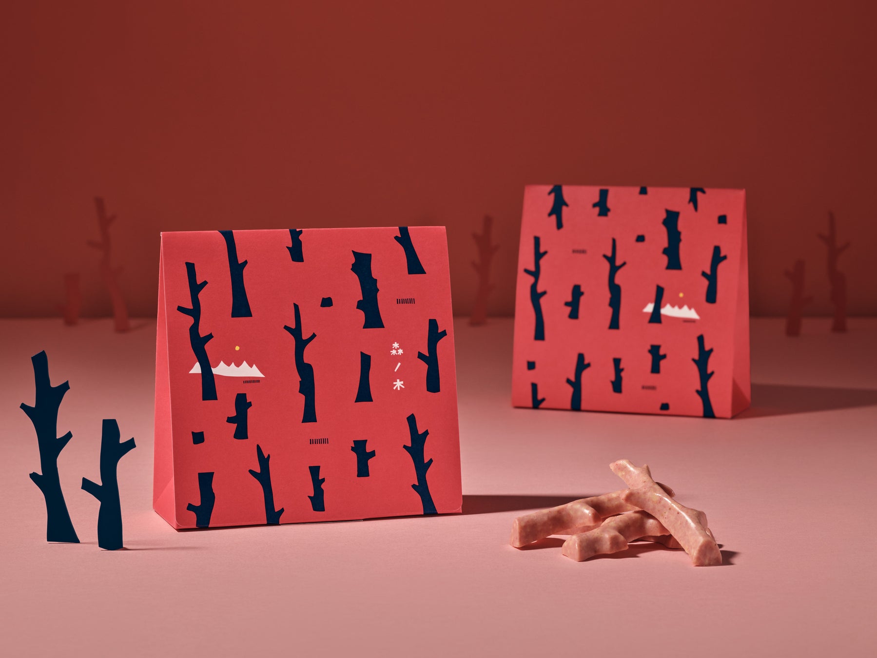爽やかな酸味と風味にこだわった北海道産のフリーズドライイチゴに、サクサク食感のピンク色のフィアンティーヌ、ホワイトクランチクッキー、刻みアーモンドを混ぜこみました。バランスの良い食感とホワイトチョコレートのやさしい甘みが調和する、見た目も楽しいクリスピーストロベリーチョコレートです。“山の版画家” 大谷一良さんの作品「森の見る夢」の木々をモチーフにした3つの形のチョコレートが特徴です。