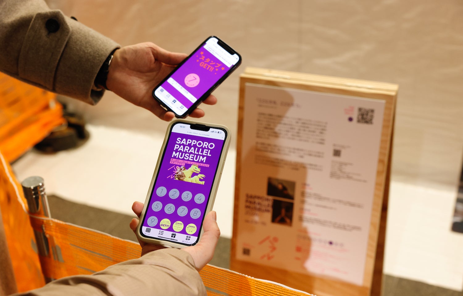 会期中、サッポロ・パラレル・ミュージアムの7会場・11カ所を巡ってスタンプを11個集めると、オリジナルグッズと交換できます。作品横のキャプションにある二次元コードをスマホで読み取って、スタンプを集めてください。
