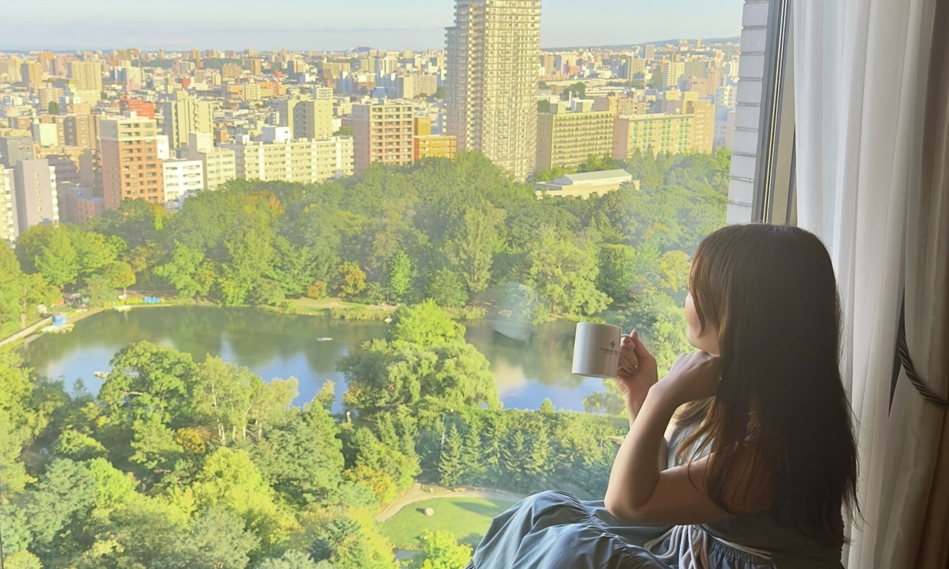 プレミアルームの窓からは、札幌の街並みと隣接する中島公園の四季折々の絶景を一望できます。この機会に贅沢なバスタイムで旅の疲れを癒し、春の中島公園での滞在をお楽しみください。