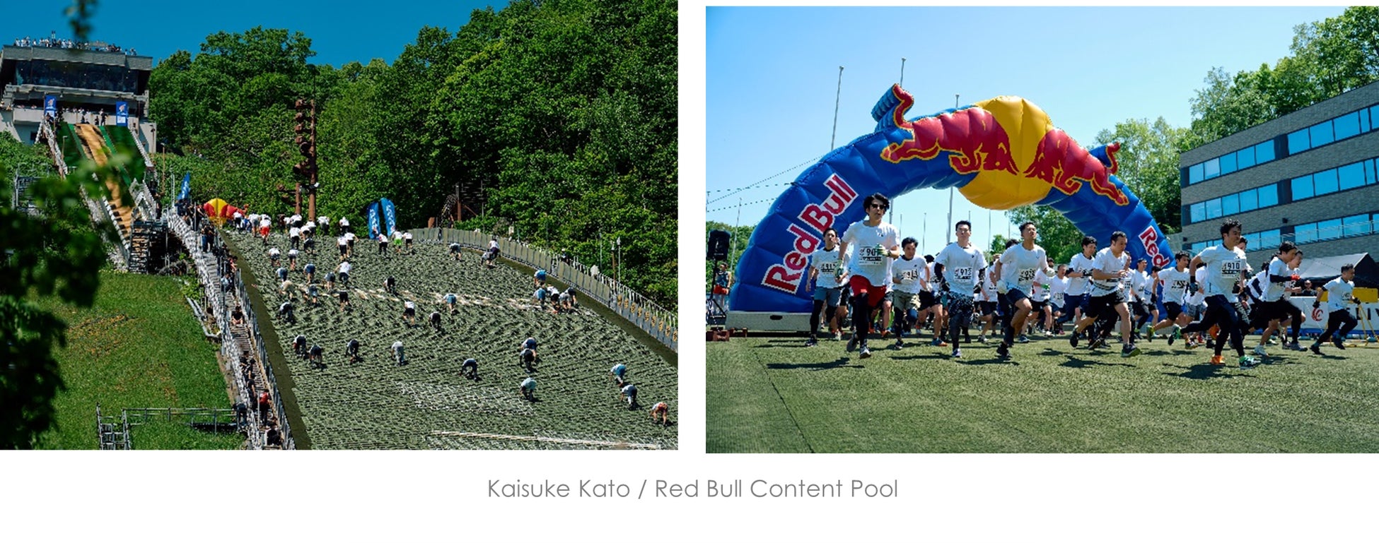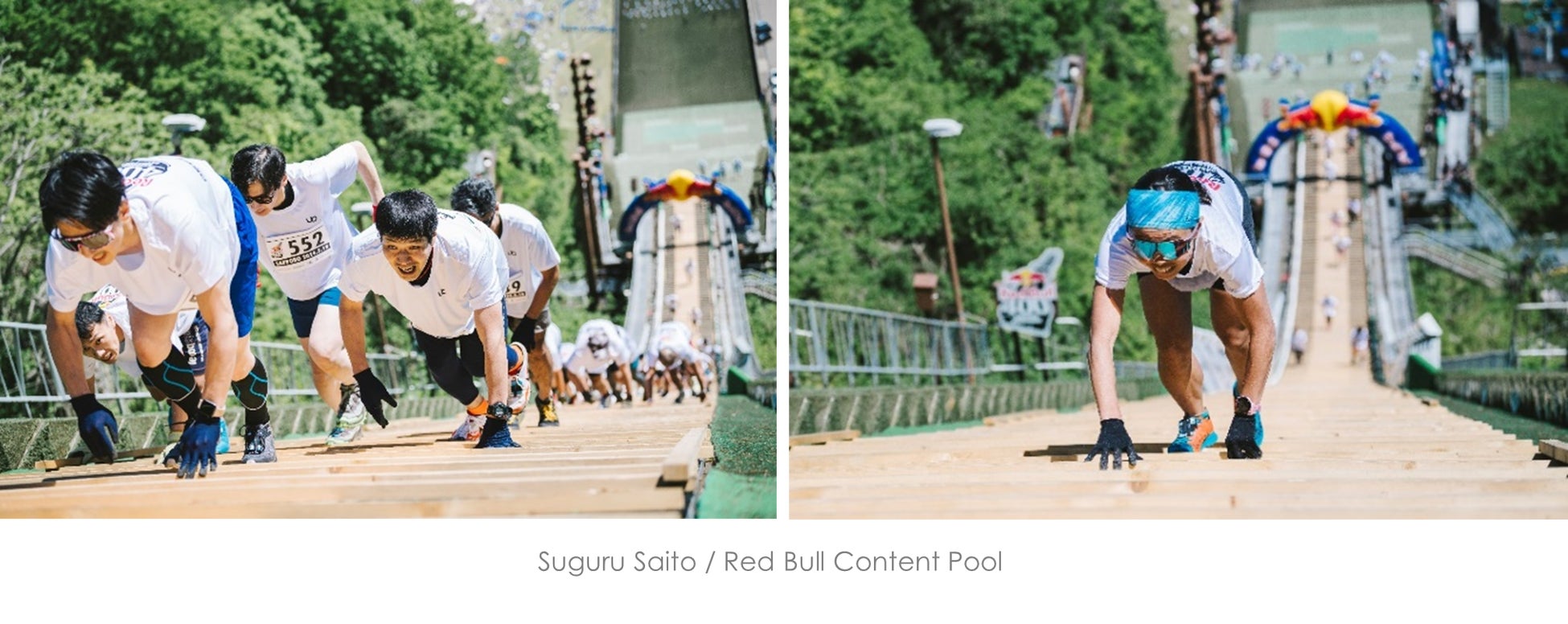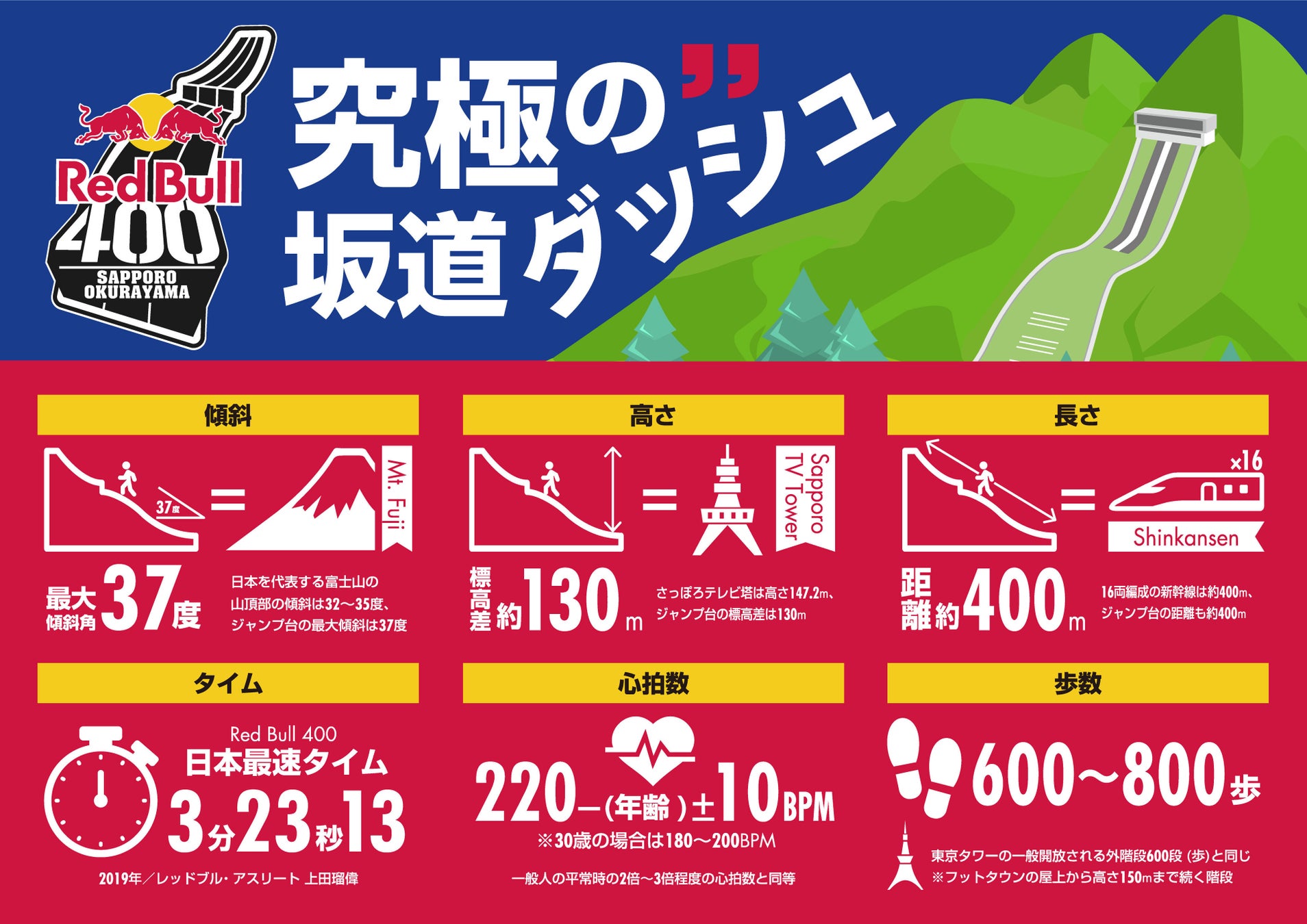 「Red Bull 400」は、男女個人・4×100m リレーの各種目に分かれ、長さ400mにわたるラージヒルのスキージャンプ台を一気に駆け上がり最高タイムを競うイベントです。最高斜度は富士山の山頂付近の傾斜(32度〜35度)を超える37度。立ったまま登ることがままならないほどの絶壁を誇ります。さらに、高低差は、札幌市のシンボル「さっぽろテレビ塔」に匹敵する約130mに及び、心拍数は平常時の約2倍〜3倍まで上がると言われています。