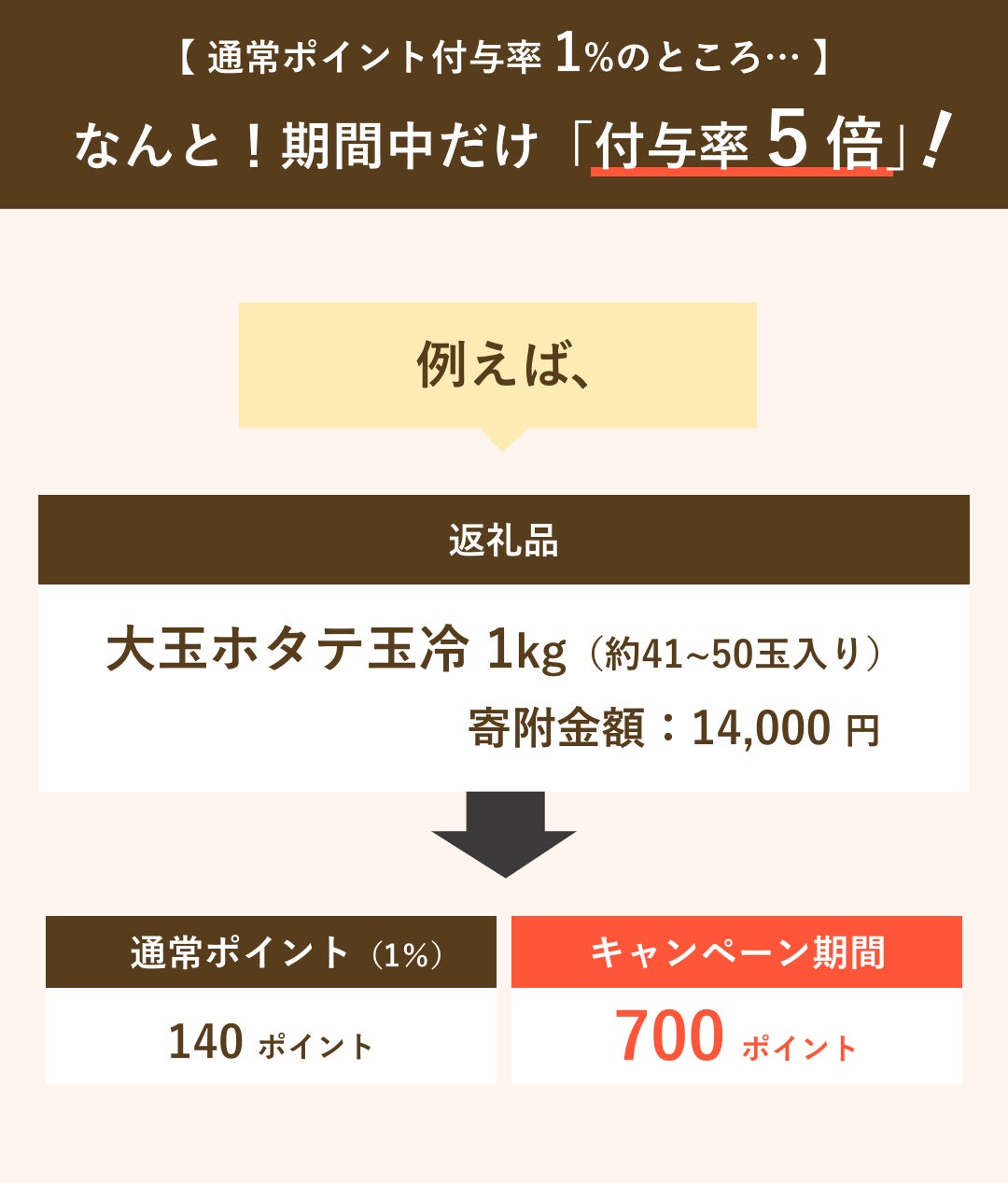 参考例として、左の画像のように「大玉ホタテ1KG:寄附金額14,000円」のお申込みだと、通常付与するおかわりポイントは140P(付与率1%)ですが、キャンペーン中は700P(付与率5%)となります。