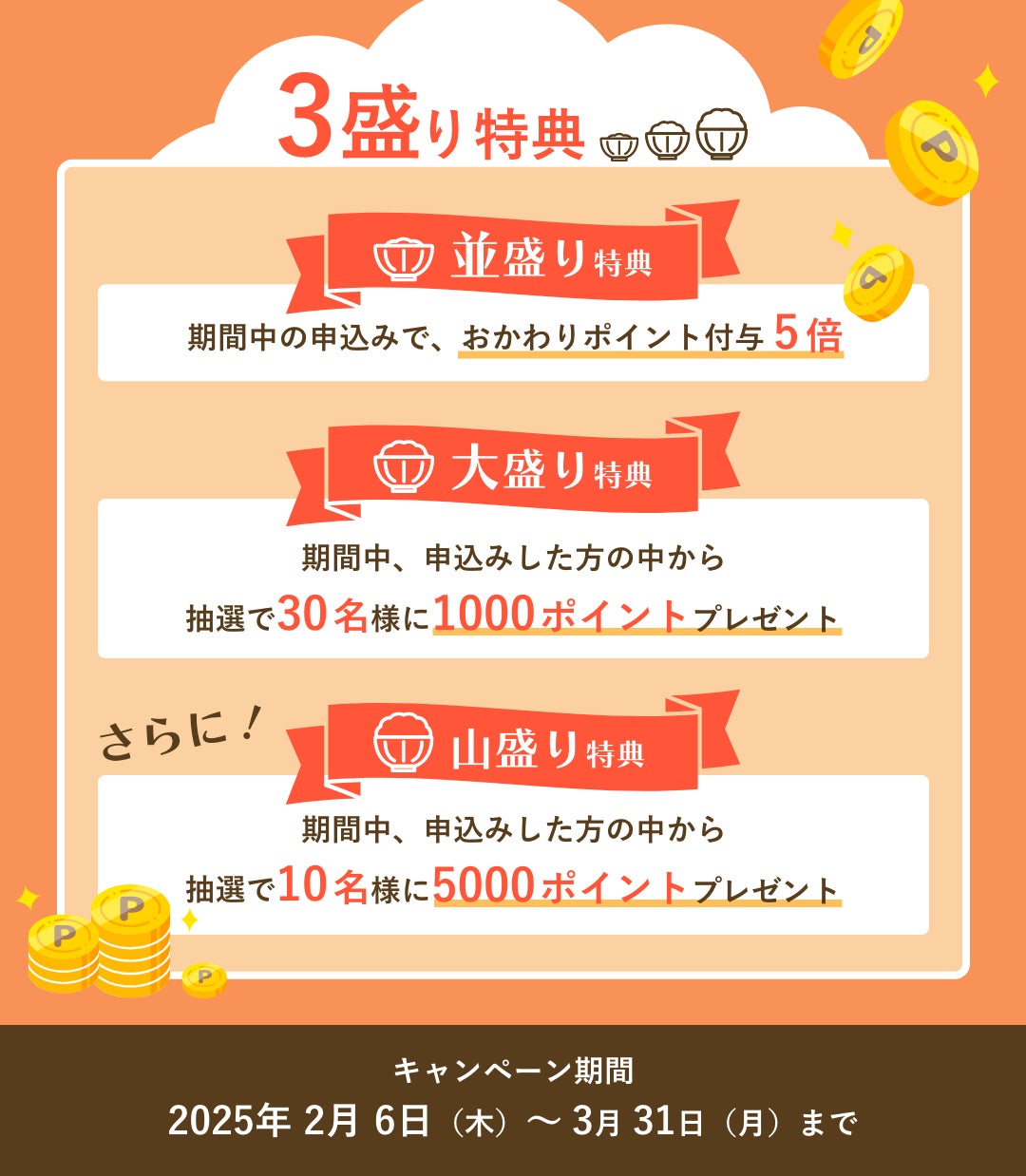 【山盛り特典】期間中お申込みいただいた方の中から、抽選で10名様におかわりポイント5,000ポイントプレゼント