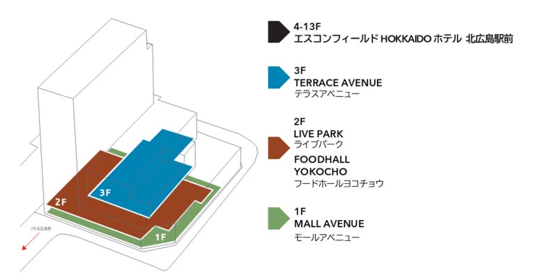 当該複合交流拠点施設は、1階から3階は商業施設「tonarie北広島」、4階から13階は「エスコンフィールドHOKKAIDOホテル 北広島駅前」となっております。