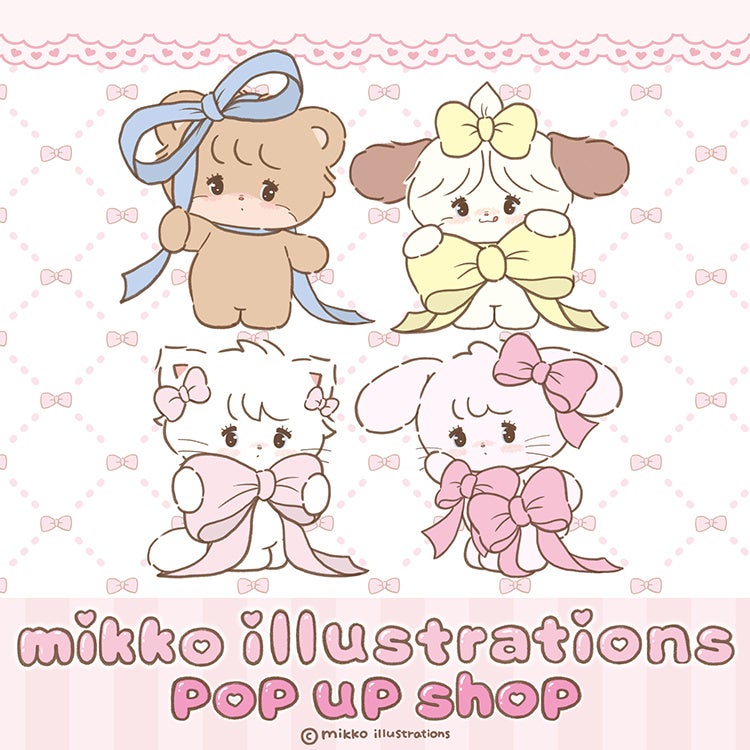mikko illustrationsの世界観を感じられる店内やムース、キャミ―、ラテ、スフレの大きなぬいぐるみのフォトスポットをお楽しみ頂けます。人気のマスコットだけでなく、ポーチ、ヘアクリップ、バッグなどバリエーションのあるアイテムが充実。札幌初開催のPOP UPにぜひお越しください。
