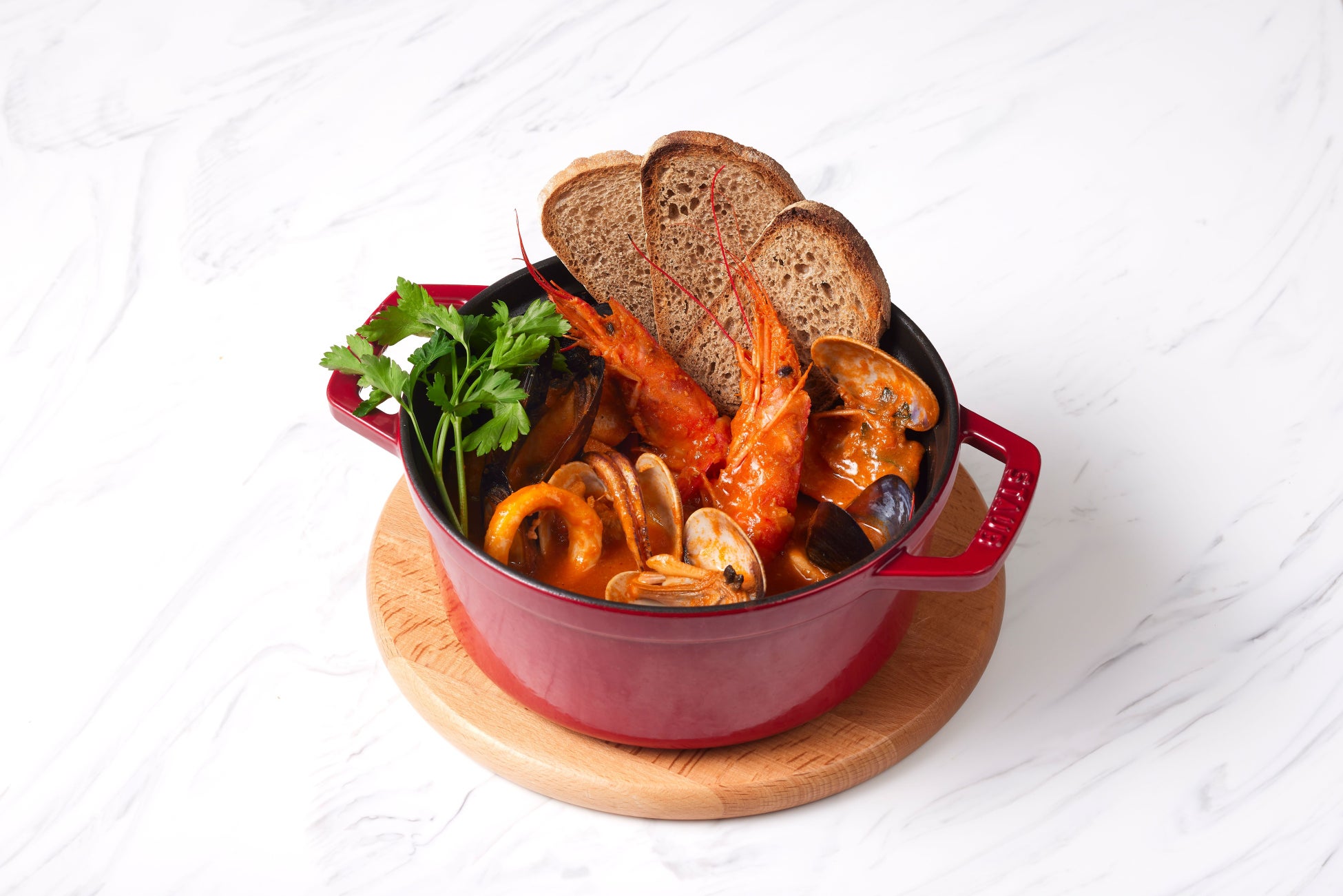 トスカーナ州 リヴォルノ郷土料理で、様々な魚介類をトマトソースで煮込んだ鍋料理。魚介のうまみが溶け込み、風味豊かで身体が温まる一品。