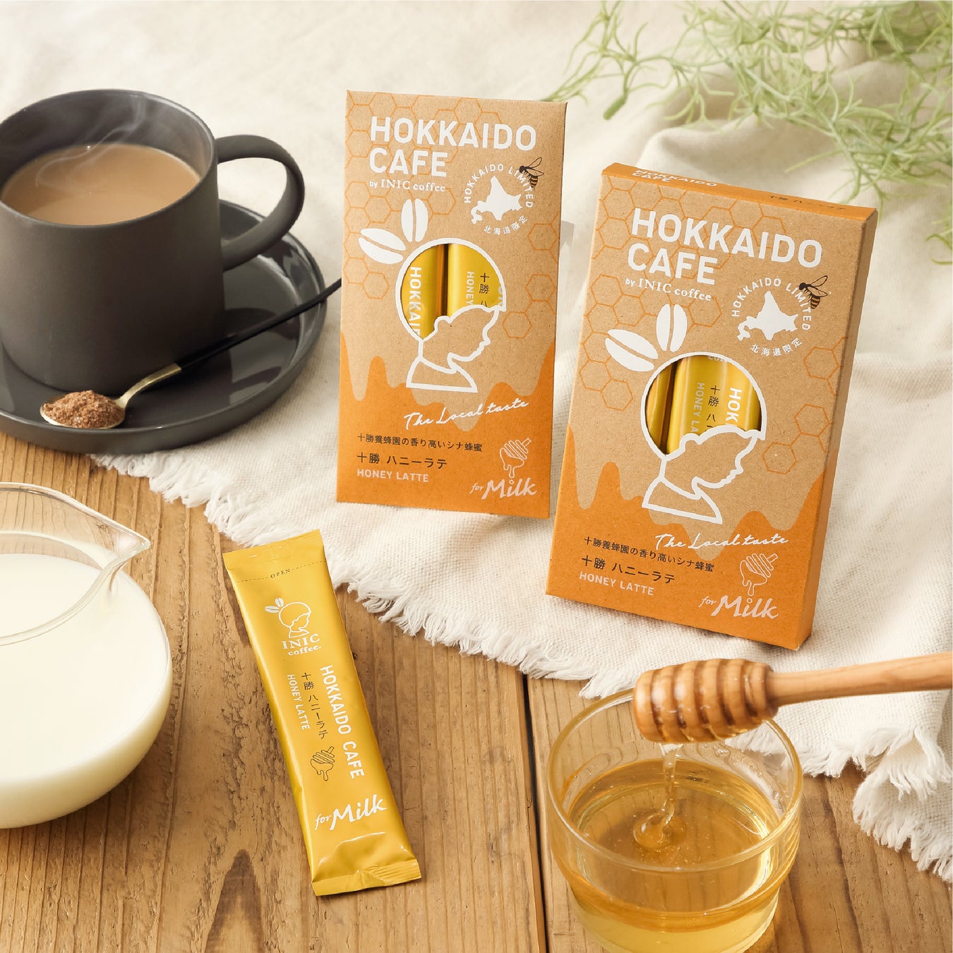 INIC coffeeには国産はちみつパウダーをコーヒーにブレンドした人気商品「ハニーコーヒー」がありますが、「十勝ハニーラテ」には異なるコーヒー豆を使用。シナ蜂蜜の香りの長所を活かしつつ、ラテに最適なコーヒーの味わいを一から作り上げました。