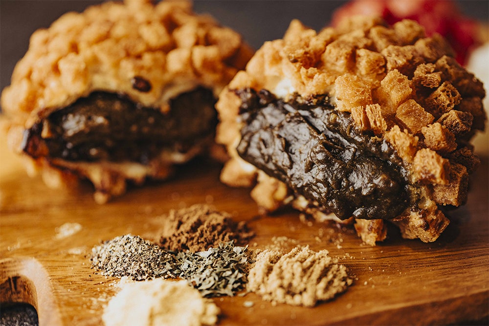 大自然の恵みを存分に受け、地元食材を使用したリピート率No.1の「淡路牛カレーパン」は、淡路牛を使い、玉ねぎ、数種類の野菜を加えて煮込み、十数種類のスパイスで仕上げた黒カレーとザックザクの自家製クルトンを外側にまとわせ長時間揚げたパンが見事にマッチ。ザクっとした食感でモチっとした甘めのパン生地がスパイシーな黒カレーを引き立てる絶品カレーパンです。