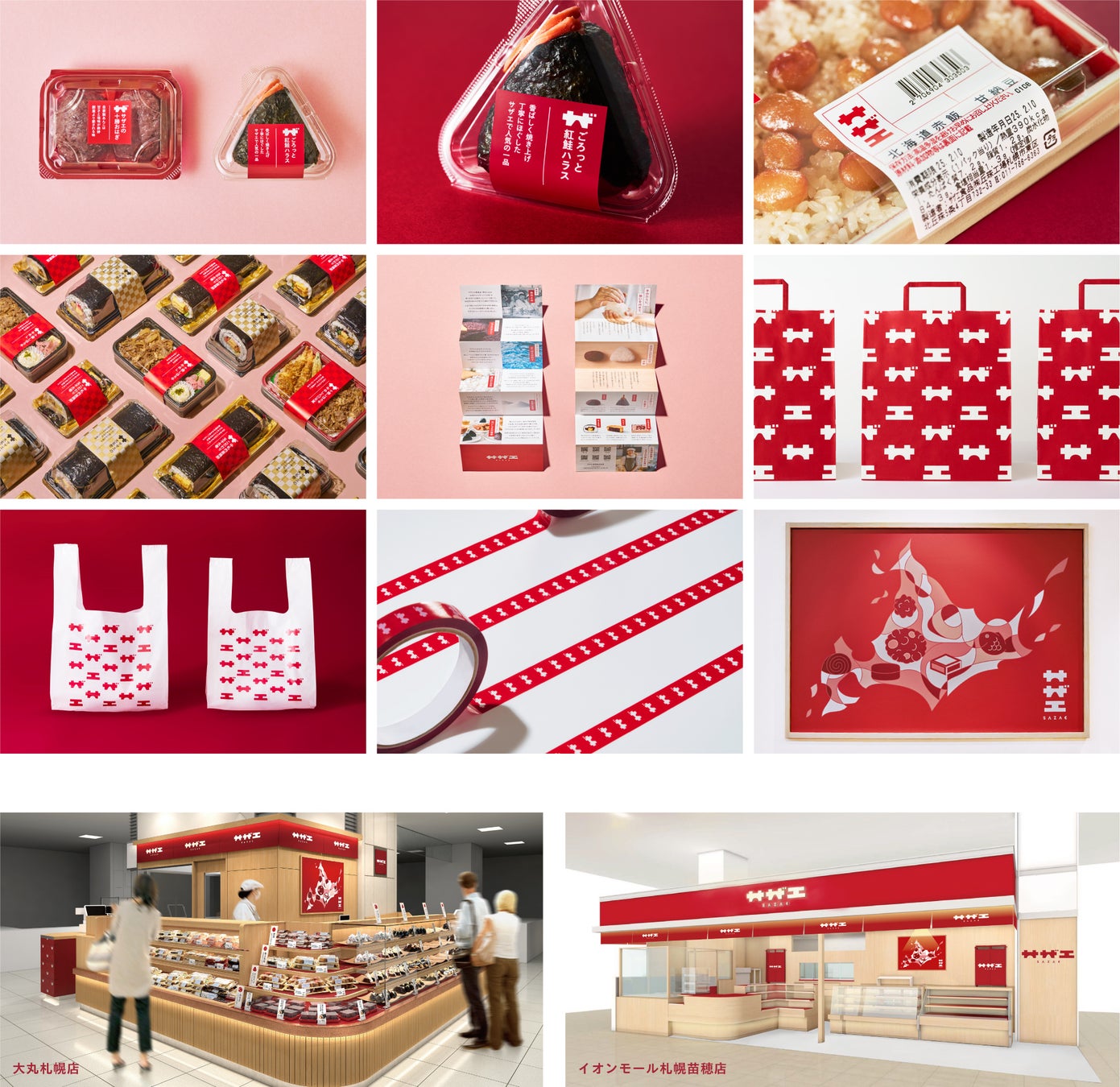 パッケージデザインは、手に取っていただいたお客様に商品のこだわりやおいしさを伝えられるよう、商品名と商品説明をセットにしたラベルシステムを開発。商品情報をまとめた「サーマルラベル」もオリジナルでデザインしました。店舗デザインは、創業時の想いを受け継ぎながら、「現代のサザエ食堂」をコンセプトに現代的で親しみやすいデザインを開発。食堂を想起させるブランドカラーで仕上げたのれんを目印に、明るく品質感を高める木との調和された空間へと生まれ変わりました。また、北海道全域で展開するサザエであることを表した北海道の地形とおはぎやおむすびなど、主要商品をグラフィカルにデザインしたアートワーク「サザエ北海道図」を制作しました。