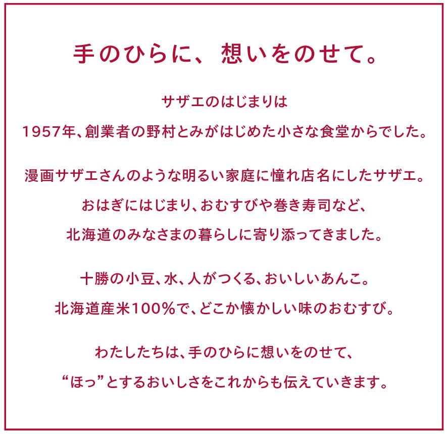 サザエ食品は、1957年に函館の朝市のサザエ食堂から創業を開始。当初まかないとして作っていたおはぎがおいしいと話題になり、食堂からおはぎのお店へと転身しました。創業者の野村とみさんは、漫画「サザエさん」のように、明るく親しみやすい会社を目指していたことから社名をサザエとし、現在は北海道で約60店を展開。創業者の思いが受け継がれた社風や接客が北海道民に愛され、「サザエさん」の愛称で親しまれています。