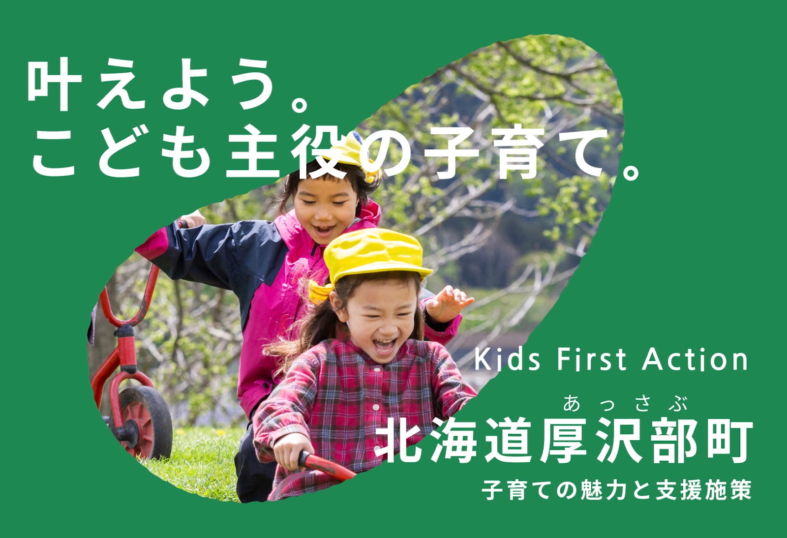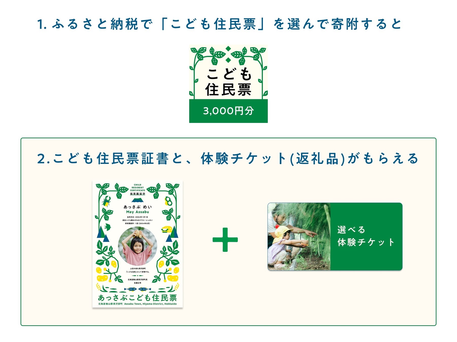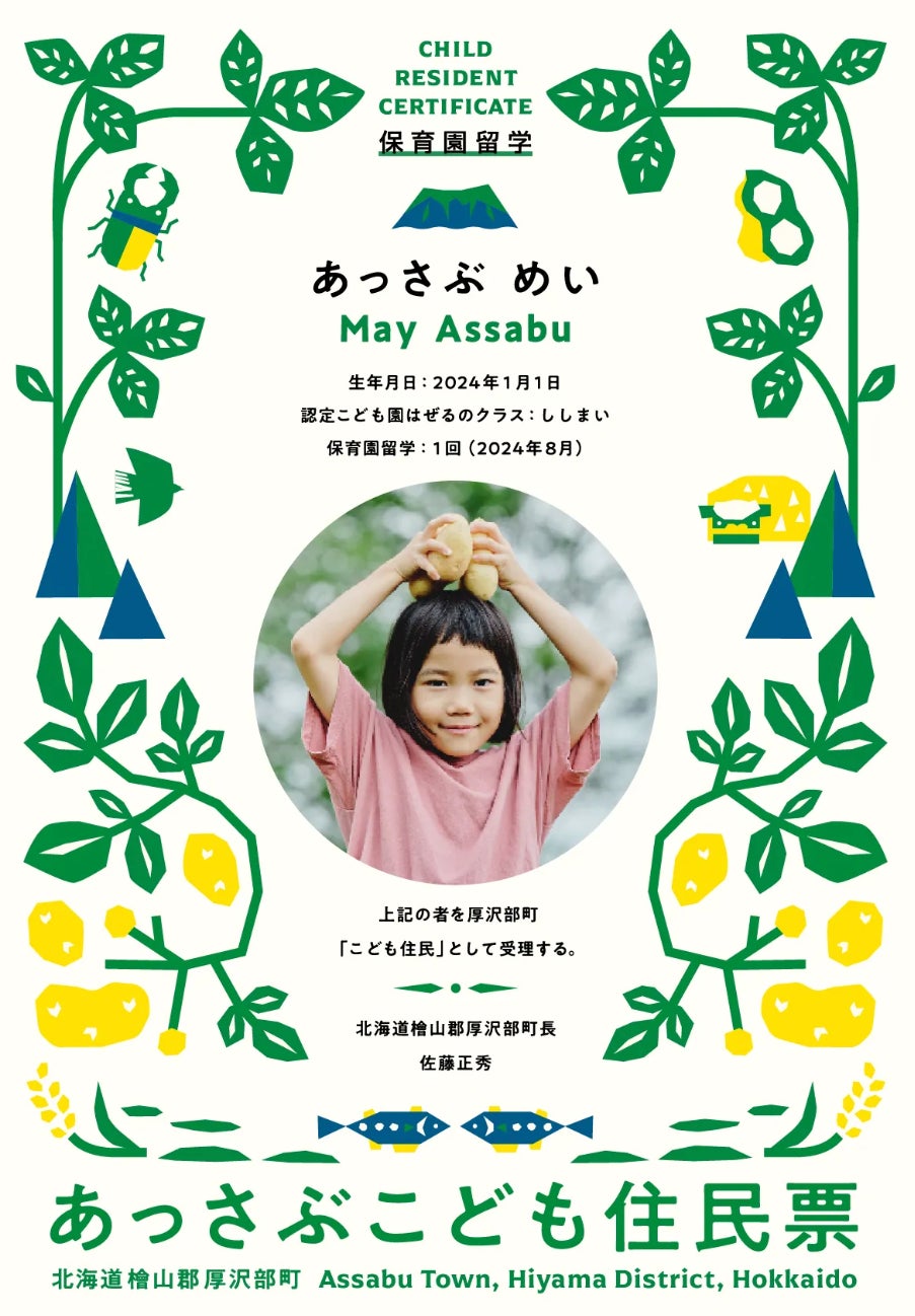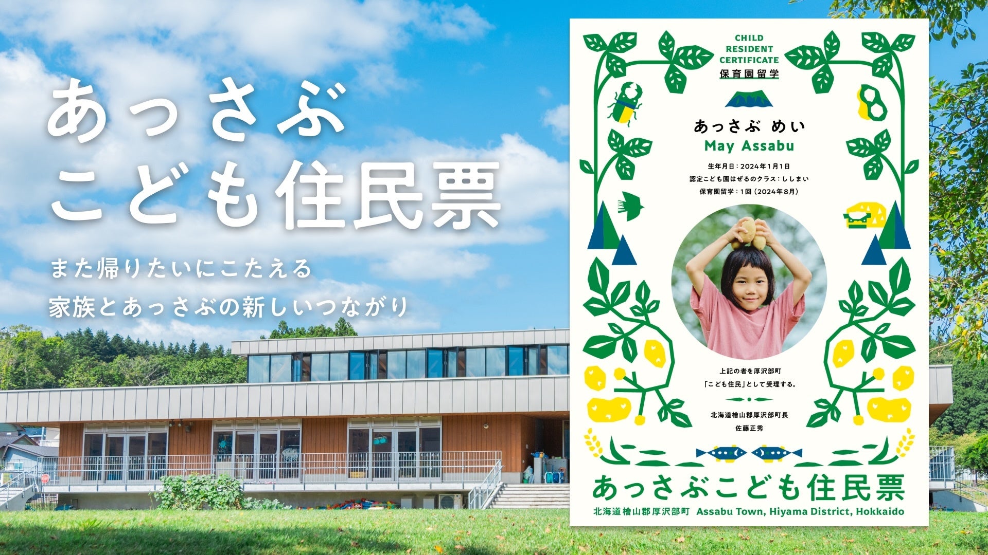 「こども住民票」は、保育園留学家族の「また帰りたい」にこたえる家族と地域の新しいつながりです。厚沢部町が好きと想ってくださるお子さん、ご家族が、離れていても住むように厚沢部を応援でき、町民のように厚沢部のいいところを受け取れる仕組みです。