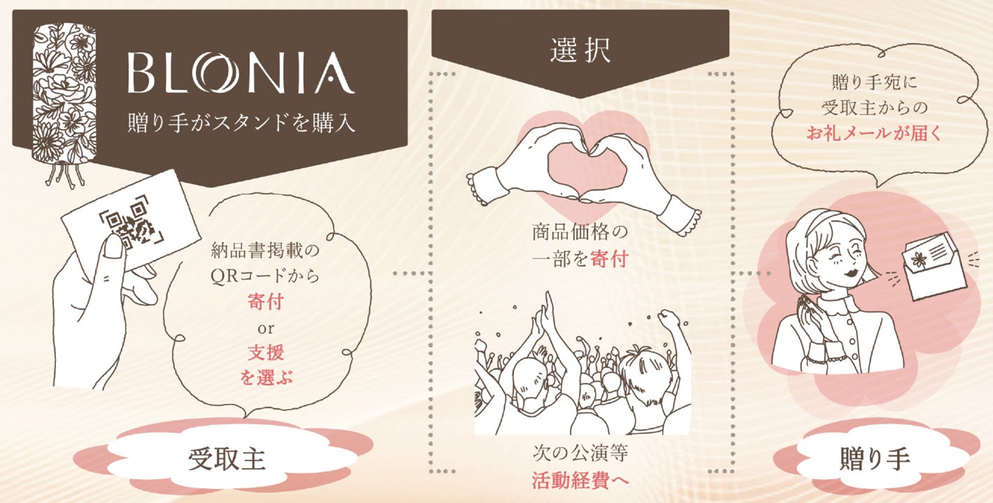 また、商品価格の一部金額(10%)を受け取り側が選択肢の中から寄付へと還元出来る仕組みを導入し、対象公演を祝う気持ちをその日限りにせず、社会貢献にも繋げる、全く新しい祝い花体験を実現します。