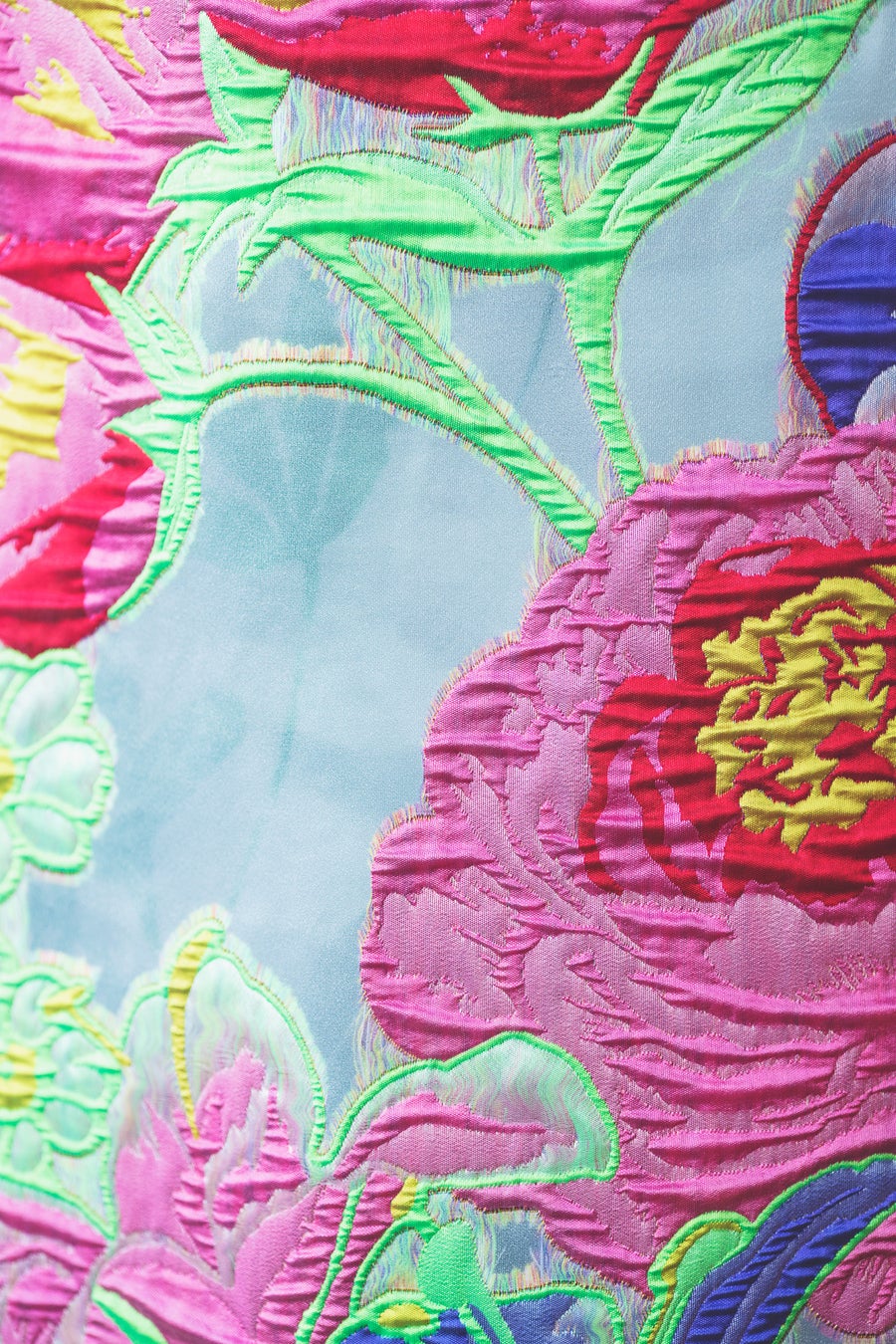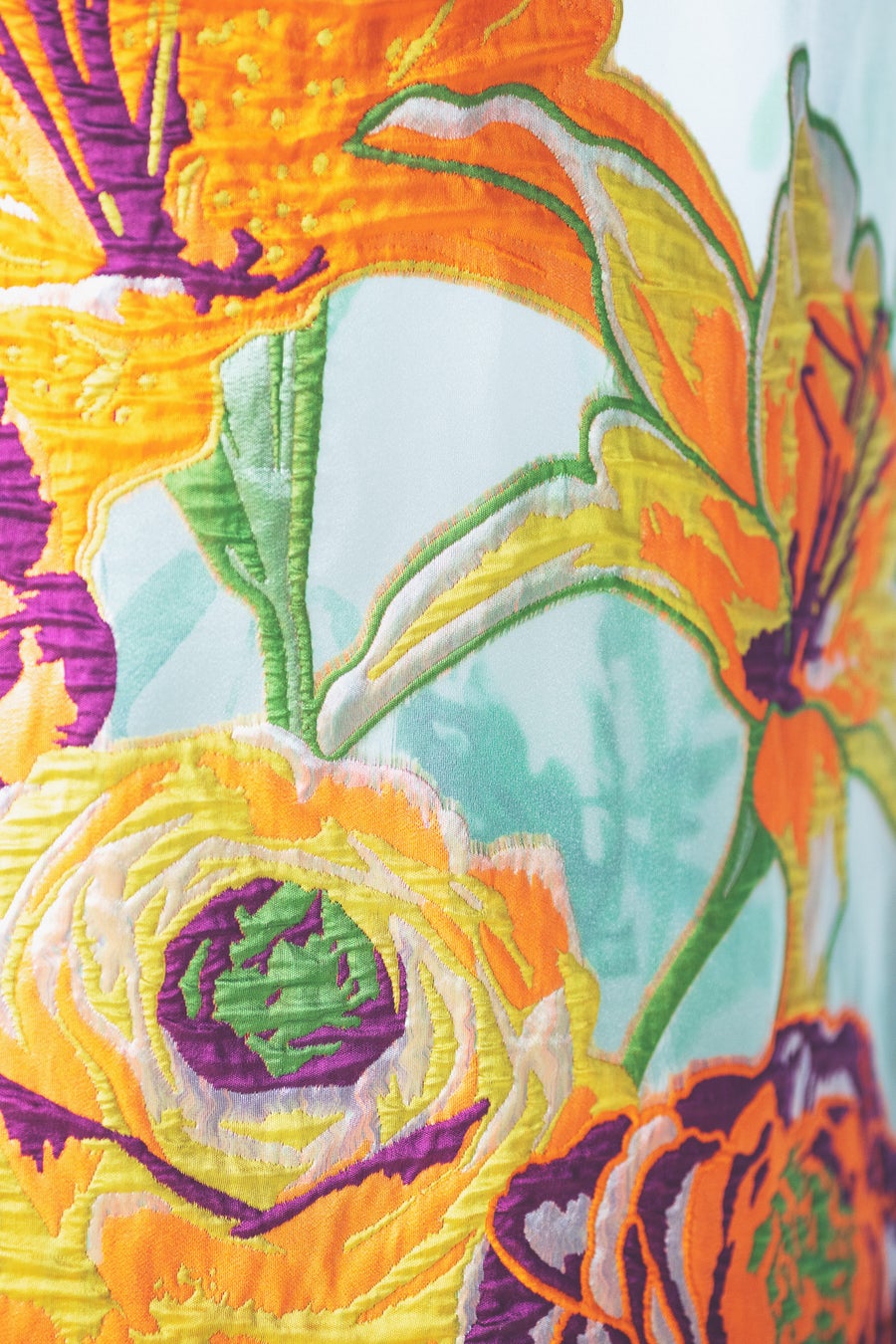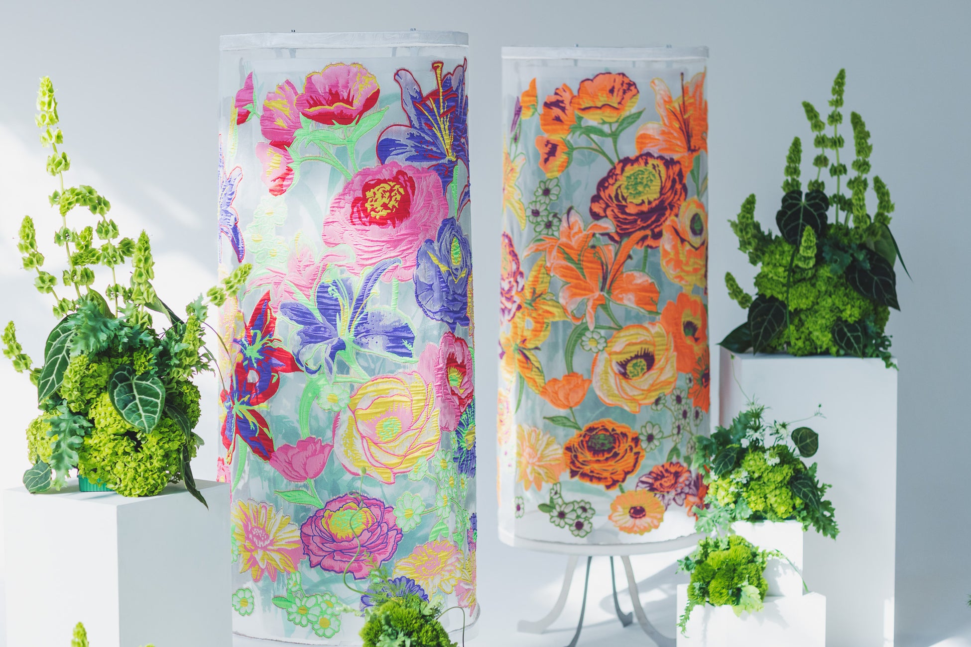 お祝い花の華やかさを表現するプロダクトとして、奥行き感を表現するためにオーガンジーベースのカットジャガードと膨れ織が融合したテキスタイルデザインを制作しました。「お祝い花」「贈り花」としてコンサート会場やお店前の路面などに設置することを想定し、ビッグサイズのパネル柄で大胆な花柄を立体的に表現しています。
