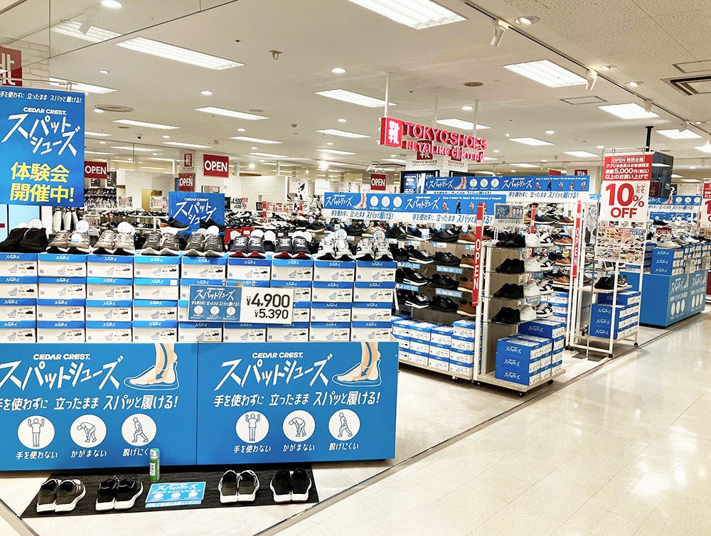 この度、北海道エリア2店舗目となる「TOKYO SHOES RETAILING CENTER」は、「東京靴流通センター」や「シュープラザ」を運営する株式会社チヨダが駅前商業施設やショッピングセンター内の店舗を中心に展開している業態です。紳士靴、婦人靴、子供靴からスニーカーまで、充実したラインナップを揃えて、靴の専門スタッフがお客様の靴選びを快適にサポートさせていただきます。新感覚の履き心地で大人気の手を使わずに立ったままスパッと履ける『スパットシューズ』シリーズは道内ナンバー1の売り場で、豊富なデザインとカラーバリエーションをご用意しております。