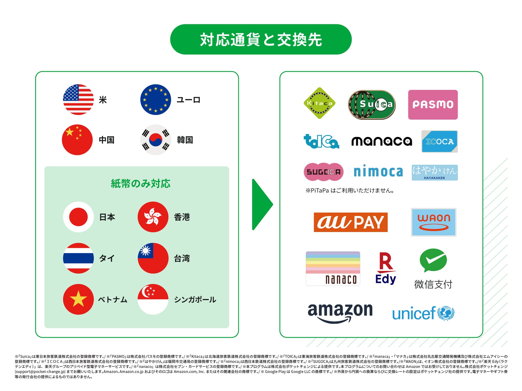 海外旅行から日本に帰って来た途端に使い道がなくなってしまう外貨をPocket Changeで電子マネーやギフトコードに交換することで、日本でのお買い物や交通費としてご利用いただくことが可能です。