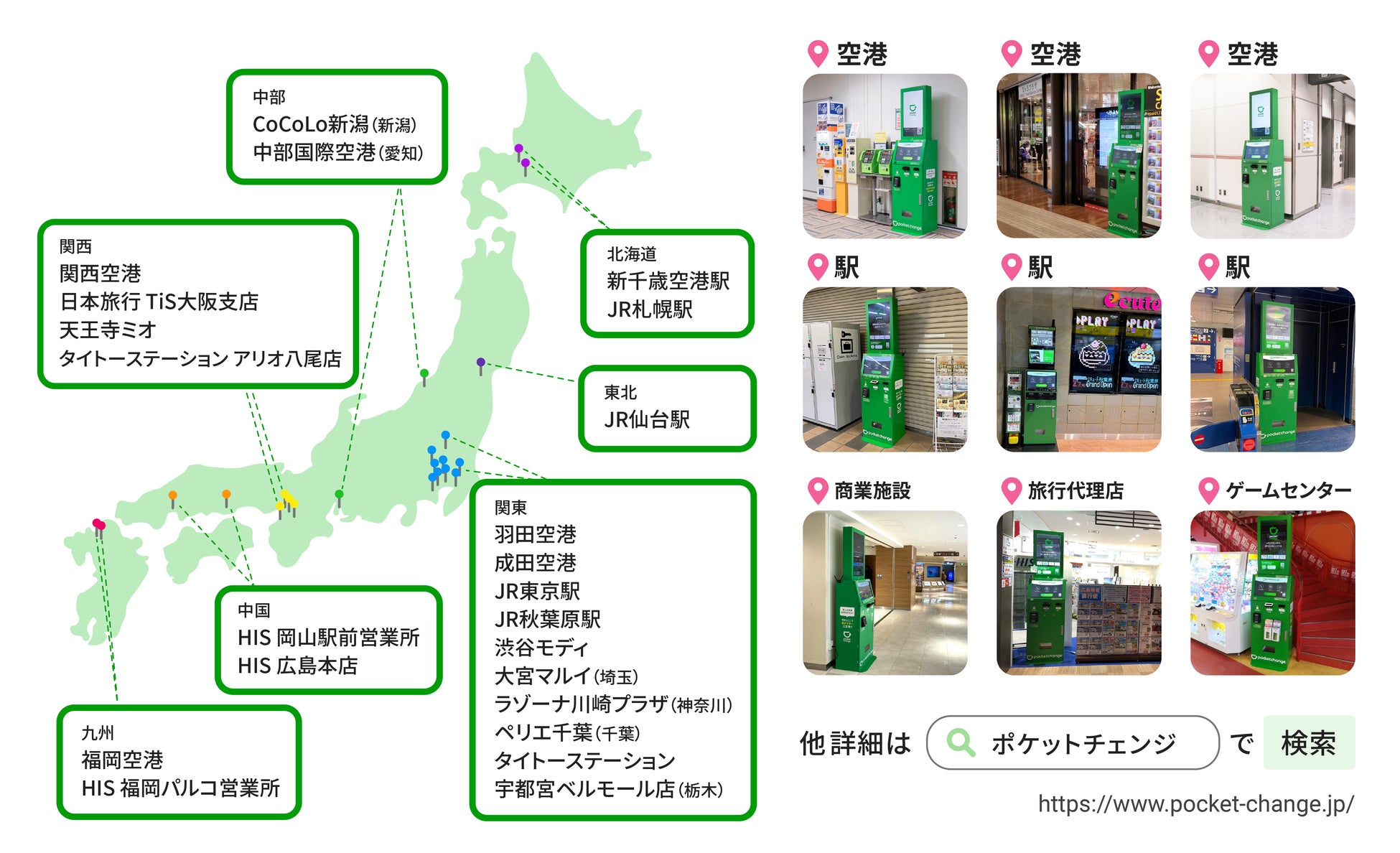 Pocket Changeはこれまで全国の空港や鉄道駅をはじめ、商業施設やゲームセンター、旅行代理店など北海道から福岡まで全国に設置し、サービスを展開しております。