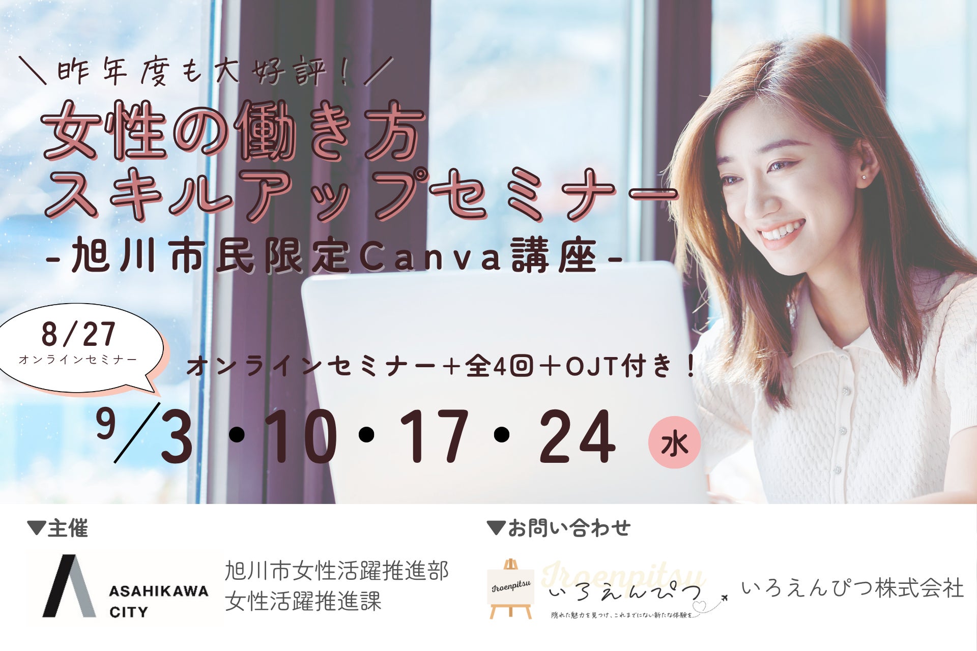 いろえんぴつ株式会社(本社:北海道旭川市、代表取締役:大田原裕希)は、この度、旭川市女性活躍推進部女性活躍推進課からの委託を受け、「女性の働き方スキルアップセミナー」を2025年9月に開催いたします。本セミナーは、働く意欲のある女性を対象に、生成AIとCanvaの活用方法からSNS運用の基礎、さらには副業・在宅ワークで案件を獲得するための実践的なノウハウまで、全5回にわたって提供します。