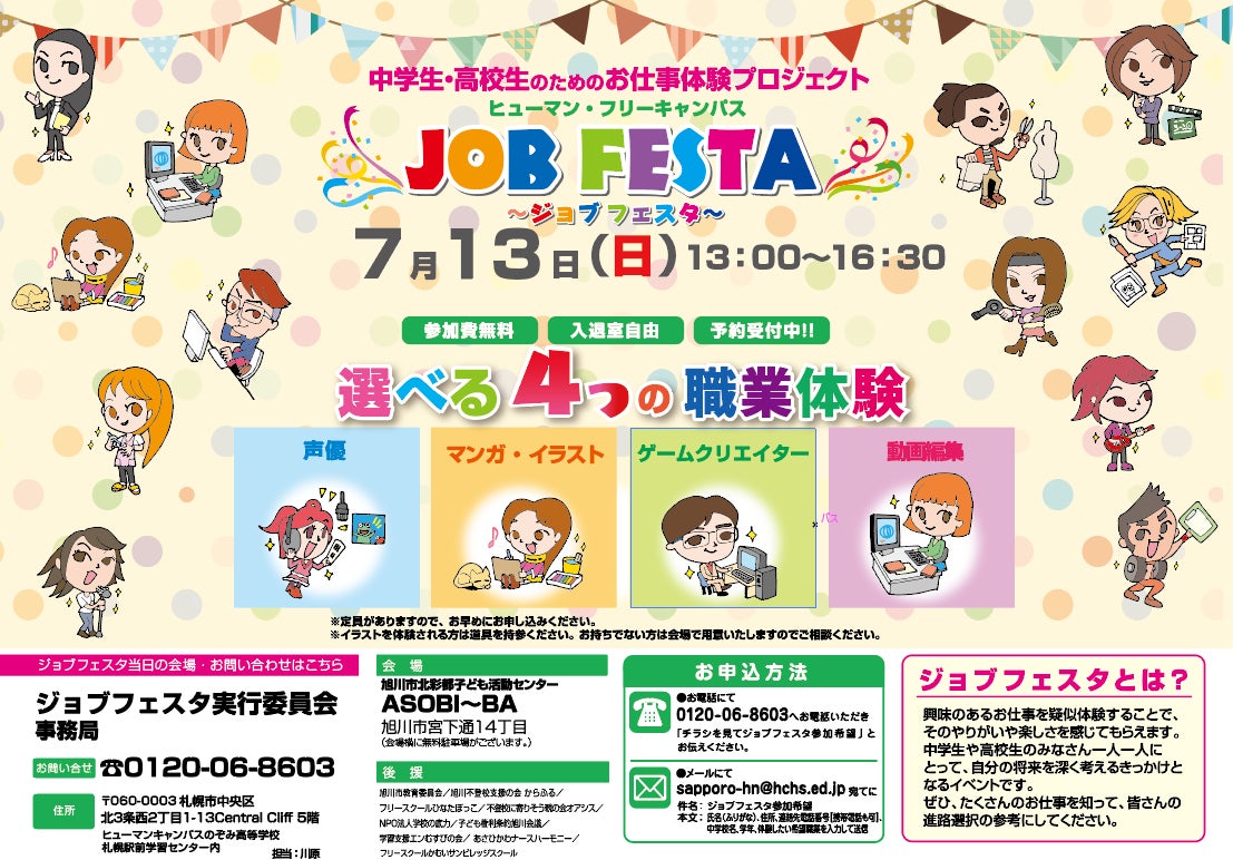 ■■開催概要■■〇開催日時:2025年7月13日(日) 13:00~16:30 (受付開始 12:30)※申込締切日:2025年7月12日(土)17:00〇会場:旭川市北彩都子ども活動センター ASOBI~BA (北海道旭川市宮下通14丁目)〇対象:中学生、高校生、保護者〇定員:80名程度(※定員になり次第、締切とさせていただきます)〇参加費:無料〇持ち物:スリッパ・上靴 (※イラスト体験を希望される方は、使い慣れた画材があればご持参ください)〇申込方法:お電話またはWebフォームにてお申し込みください。 ①電話:0120-06-8603 へお電話いただき、「チラシを見てジョブフェスタ参加希望」とお伝えください。 ②Webフォーム:https://forms.gle/hWhYSeszJsDiqof98〇主催:ジョブフェスタ実行委員会〇後援:旭川市教育委員会、不登校によりそう親の会オアシス、子ども権利条約旭川会議、NPO法人学校の底力、エンむすびの会、あさひかわナースハーモニー、フリースクールかむいサンビレッジスクール■ジョブフェスタに関するお問合せ■本イベントに関するお問い合わせは、下記までご連絡のほどよろしくお願い申し上げます。【事務局】 ジョブフェスタ実行委員会 事務局(ヒューマンキャンパスのぞみ高等学校 札幌駅前学習センター内)担当:川原TEL:0120-06-8603Mail:sapporo-hn@hchs.ed.jp |