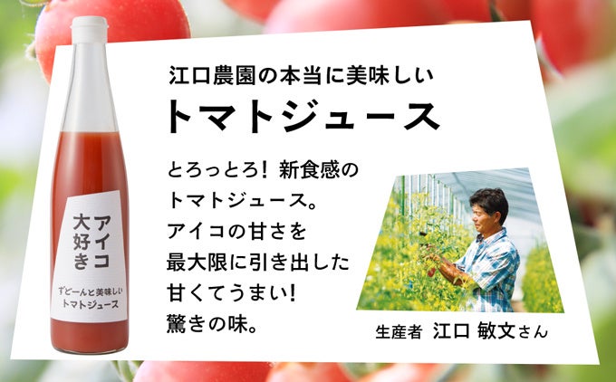果肉が厚く甘味が強いミニトマト「アイコ」にシンディスイートをブレンド。手間を惜しまずにつくった“とろっとろ” の新食感のトマトジュースです。
