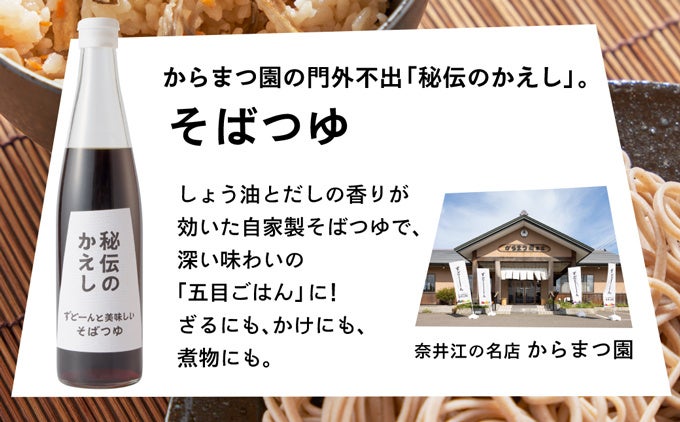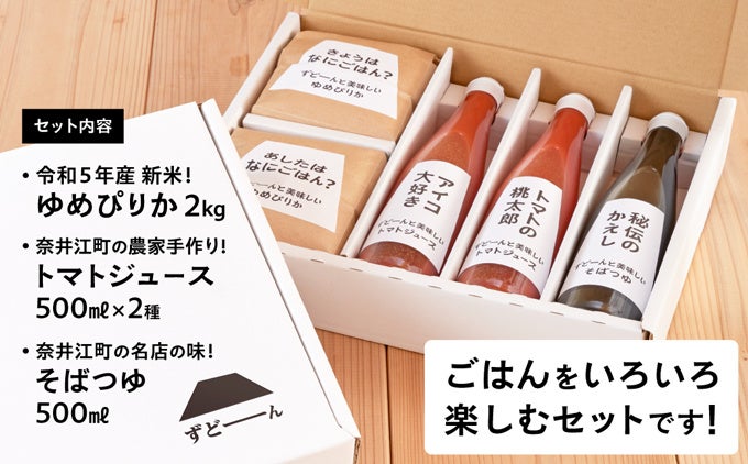 人気そば店「からまつ園」のそばつゆを詰め合わせたセットです。単品でも美味しいゆめぴりかをトマトジュースやそばつゆを使って、じぶんなりのレシピで楽しんでいただきたいという想いで企画しました。