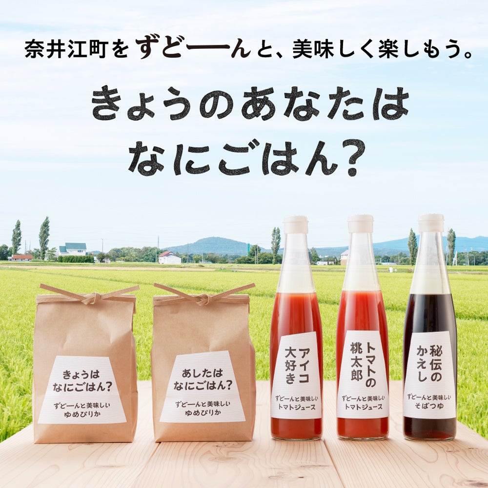 「ずどーん」は奈井江町のキャッチフレーズ。奈井江町の無形のシンボルです。奈井江町はゆめぴりかをはじめ、トマトやメロンなど美味しい農産物がたくさん育つまち。そんな“奈井江町を代表する美味しいものと美味しいもので、新しい美味しさの楽しみ方を贈ろう”をコンセプトにしたセットです。(もちろん、それぞれそのまま単品でもとっても美味しいものばかりです!)