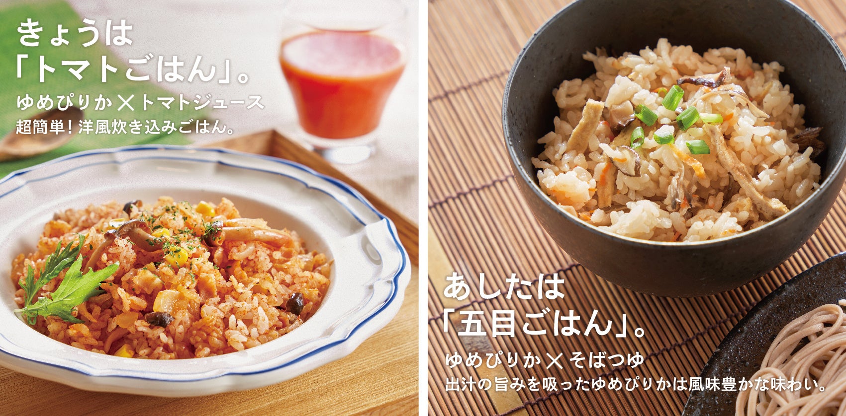 ゆめぴりかをトマトジュースやそばつゆを使ったレシピで楽しんでいただく想いを込めたセットです。セットのパッケージには奈井江町や食べ方を紹介するパンフレットを同梱しています。